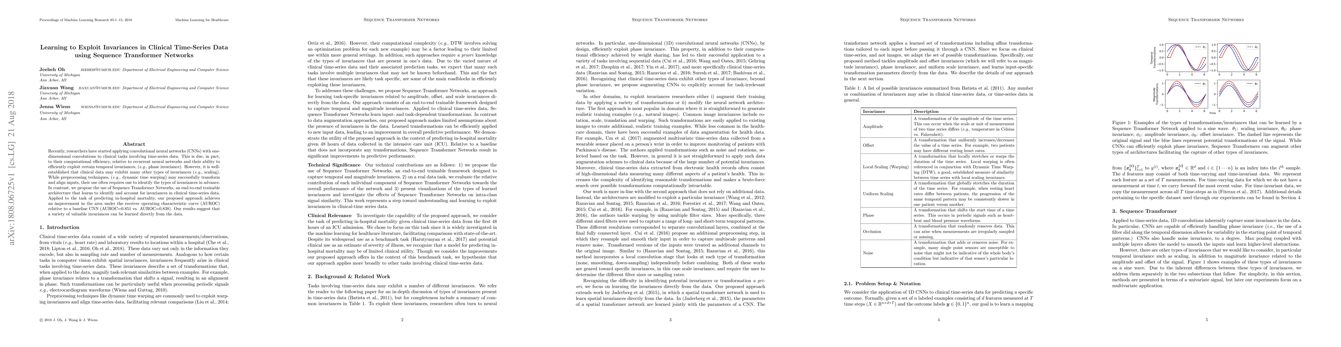 This paper proposes Sequence Transformer Networks to learn and exploit various invariances in clinical time-series data, achieving better predictive performance for in-hospital mortality compared to a baseline CNN (AUROC=0.851 vs. 0.838). The method demonstrates the potential of end-to-end learning to identify and account for multiple types of invariances without prior identification.