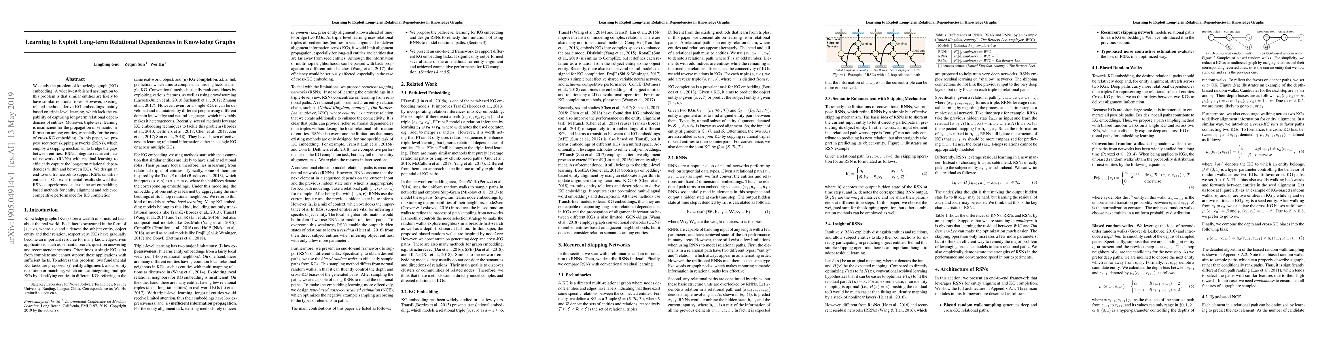 This paper proposes recurrent skipping networks (RSNs) to capture long-term relational dependencies in knowledge graphs, addressing the limitations of existing triple-level learning methods. RSNs integrate RNNs with residual learning to efficiently propagate semantic information across entities, achieving superior performance in entity alignment and competitive results in KG completion.
