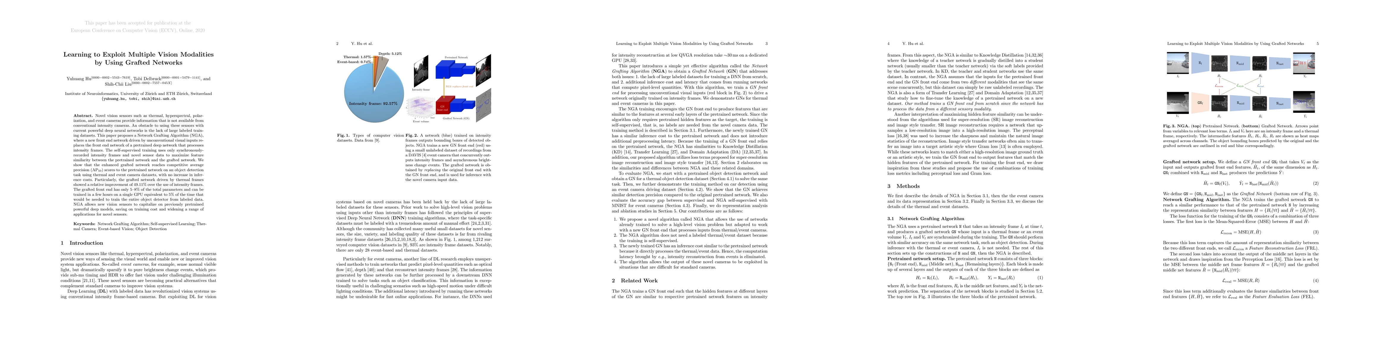 Novel vision sensors such as thermal, hyperspectral, polarization, and event cameras provide information that is not available from conventional intensity cameras. An obstacle to using these sensors with current powerful deep neural networks is the lack of large labeled training datasets. This paper proposes a Network Grafting Algorithm (NGA), where a new front end network driven by unconventional visual inputs replaces the front end network of a pretrained deep network that processes intensity frames. The self-supervised training uses only synchronously-recorded intensity frames and novel sensor data to maximize feature similarity between the pretrained network and the grafted network. We show that the enhanced grafted network reaches competitive average precision (AP50) scores to the pretrained network on an object detection task using thermal and event camera datasets, with no increase in inference costs. Particularly, the grafted network driven by thermal frames showed a relative improvement of 49.11% over the use of intensity frames. The grafted front end has only 5--8% of the total parameters and can be trained in a few hours on a single GPU equivalent to 5% of the time that would be needed to train the entire object detector from labeled data. NGA allows new vision sensors to capitalize on previously pretrained powerful deep models, saving on training cost and widening a range of applications for novel sensors.