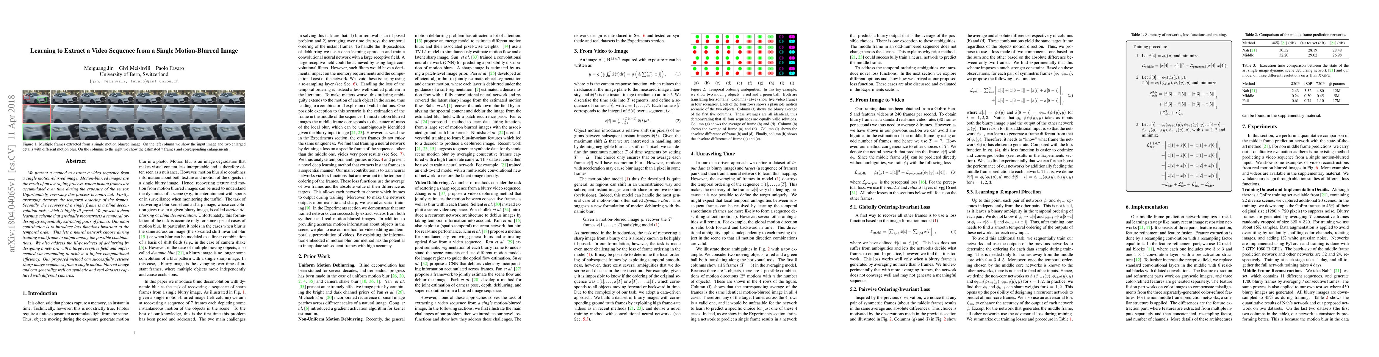 This paper proposes a deep learning method to extract a video sequence from a single motion-blurred image by sequentially reconstructing pairs of frames. The approach introduces loss functions invariant to temporal order, allowing the network to choose the correct frame during training, and employs a large receptive field network for efficient deblurring.