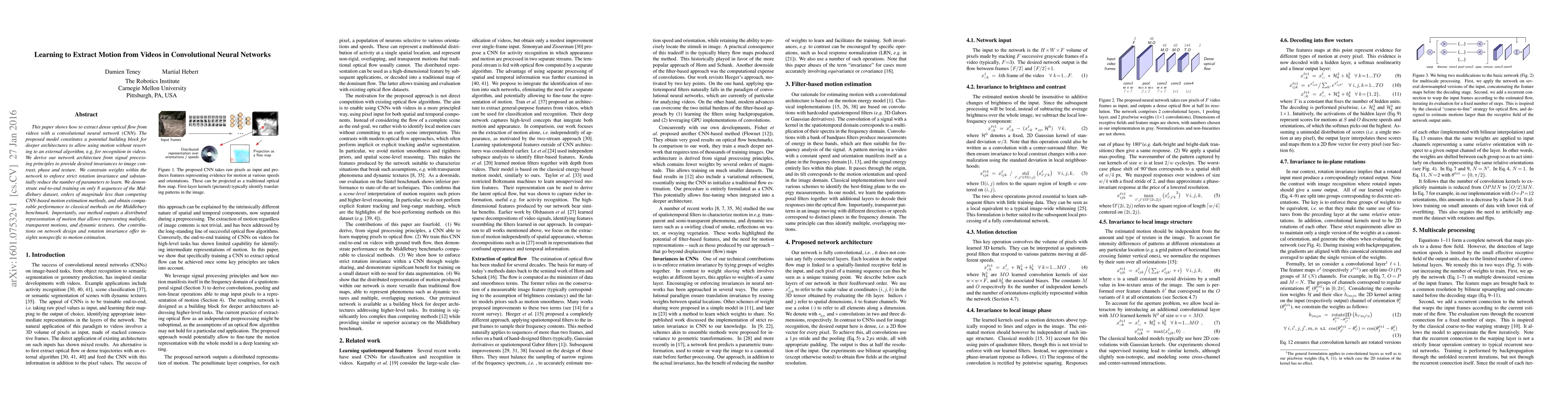 This paper proposes a CNN model for extracting dense optical flow from videos, achieving comparable performance to classical methods with significantly fewer training sequences. It introduces network design principles for invariance and reduced parameters, offering insights for broader applications beyond motion estimation.