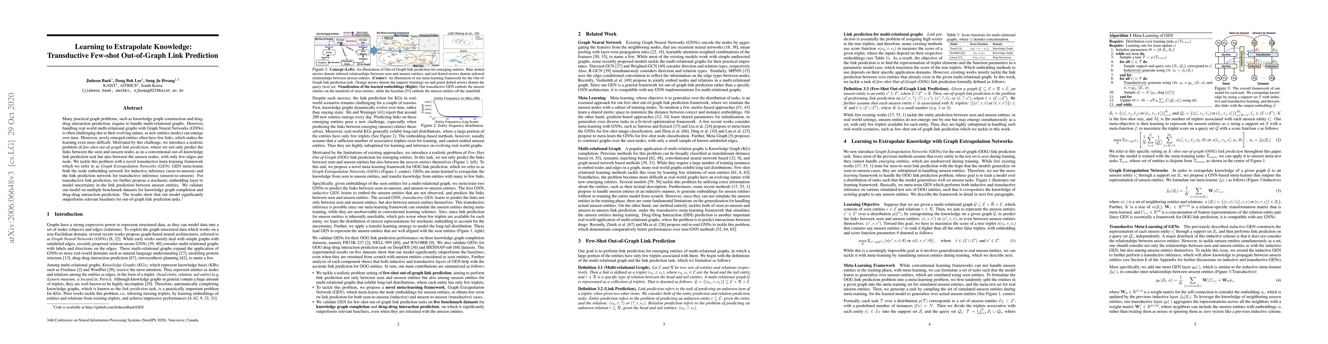 Many practical graph problems, such as knowledge graph construction and drug-drug interaction prediction, require to handle multi-relational graphs. However, handling real-world multi-relational graphs with Graph Neural Networks (GNNs) is often challenging due to their evolving nature, as new entities (nodes) can emerge over time. Moreover, newly emerged entities often have few links, which makes the learning even more difficult. Motivated by this challenge, we introduce a realistic problem of few-shot out-of-graph link prediction, where we not only predict the links between the seen and unseen nodes as in a conventional out-of-knowledge link prediction task but also between the unseen nodes, with only few edges per node. We tackle this problem with a novel transductive meta-learning framework which we refer to as Graph Extrapolation Networks (GEN). GEN meta-learns both the node embedding network for inductive inference (seen-to-unseen) and the link prediction network for transductive inference (unseen-to-unseen). For transductive link prediction, we further propose a stochastic embedding layer to model uncertainty in the link prediction between unseen entities. We validate our model on multiple benchmark datasets for knowledge graph completion and drug-drug interaction prediction. The results show that our model significantly outperforms relevant baselines for out-of-graph link prediction tasks.