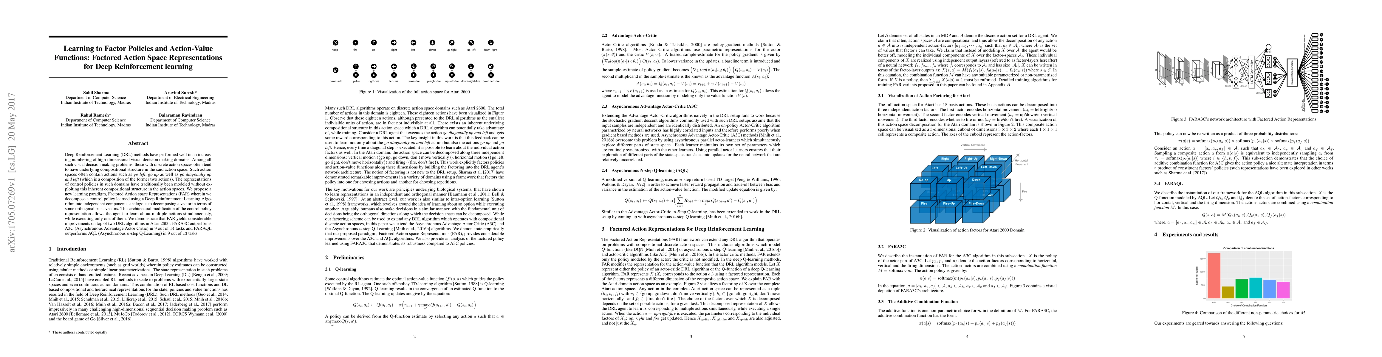 This paper proposes Factored Action Space Representations (FAR) to exploit compositional structures in discrete action spaces in Deep Reinforcement Learning (DRL). FAR decomposes control policies into independent components, allowing simultaneous learning of multiple actions. Experiments show FAR improves performance over A3C and AQL in most Atari 2600 tasks.