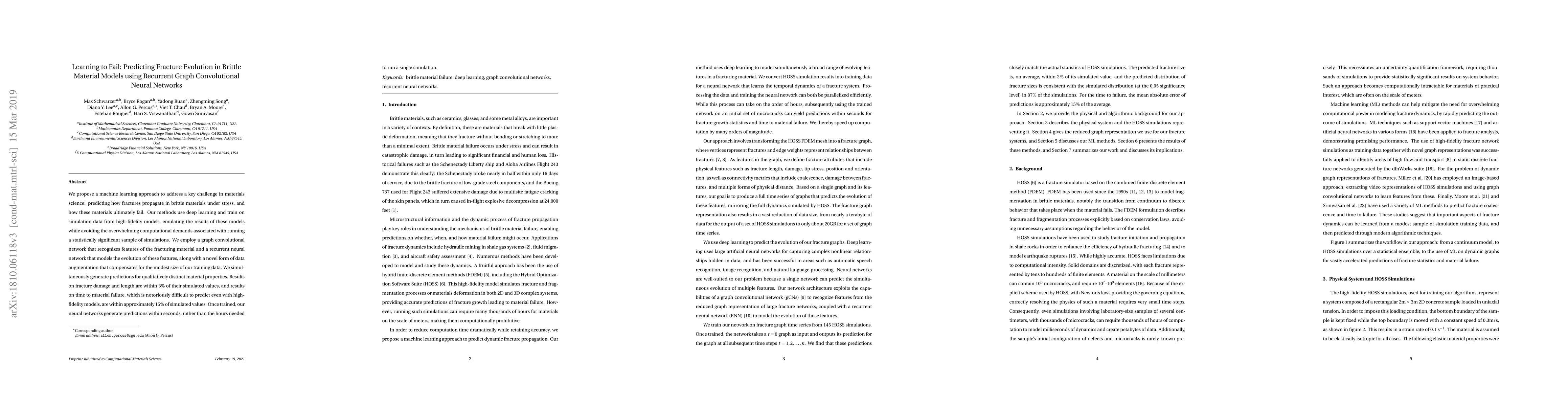 We propose a machine learning approach to address a key challenge in materials science: predicting how fractures propagate in brittle materials under stress, and how these materials ultimately fail. Our methods use deep learning and train on simulation data from high-fidelity models, emulating the results of these models while avoiding the overwhelming computational demands associated with running a statistically significant sample of simulations. We employ a graph convolutional network that recognizes features of the fracturing material and a recurrent neural network that models the evolution of these features, along with a novel form of data augmentation that compensates for the modest size of our training data. We simultaneously generate predictions for qualitatively distinct material properties. Results on fracture damage and length are within 3% of their simulated values, and results on time to material failure, which is notoriously difficult to predict even with high-fidelity models, are within approximately 15% of simulated values. Once trained, our neural networks generate predictions within seconds, rather than the hours needed to run a single simulation.
