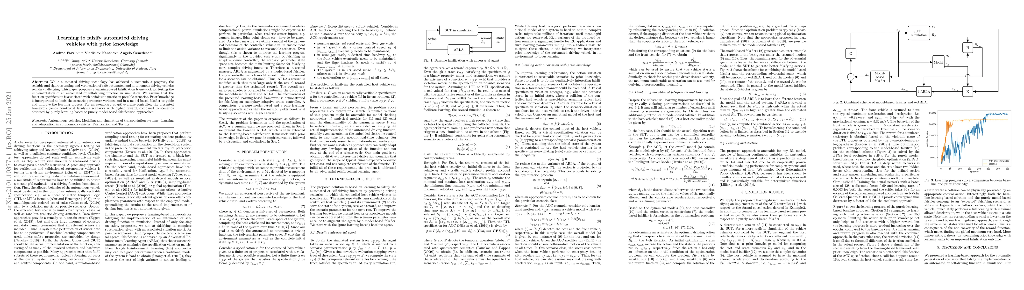 This paper introduces a learning-based falsification framework to rigorously test automated driving systems, leveraging prior knowledge to guide the process and improve the identification of potential failure scenarios. The framework effectively generates falsifying scenarios for an adaptive cruise controller, outperforming purely learning-based or model-based methods.