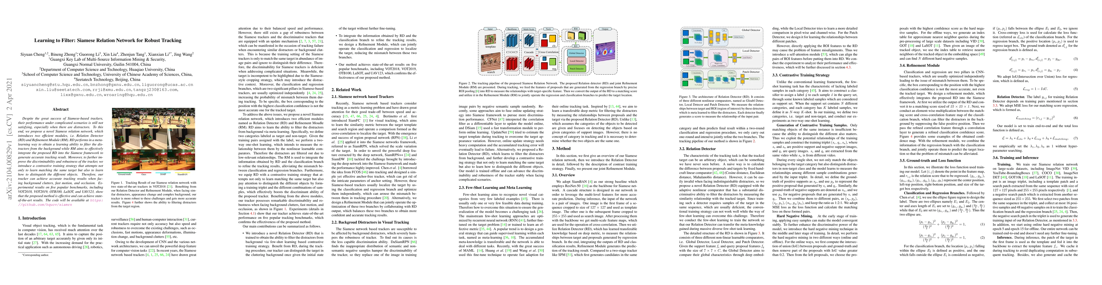 A new Siamese relation network tracker is proposed to improve performance on complicated scenarios with distractors, achieving state-of-the-art results on five popular benchmarks.