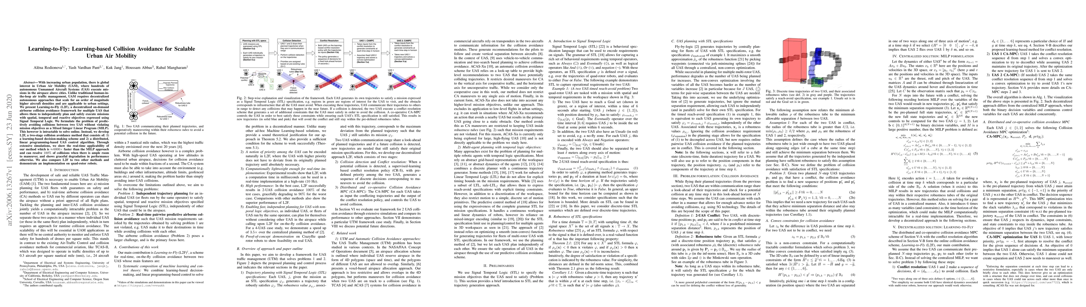 The paper introduces Learning-to-Fly (L2F), a decentralized collision avoidance framework for scalable Urban Air Mobility, utilizing a learning-based decision-making scheme and distributed linear programming to achieve real-time, efficient collision avoidance among multiple UAS, demonstrating significant performance improvements over traditional methods.