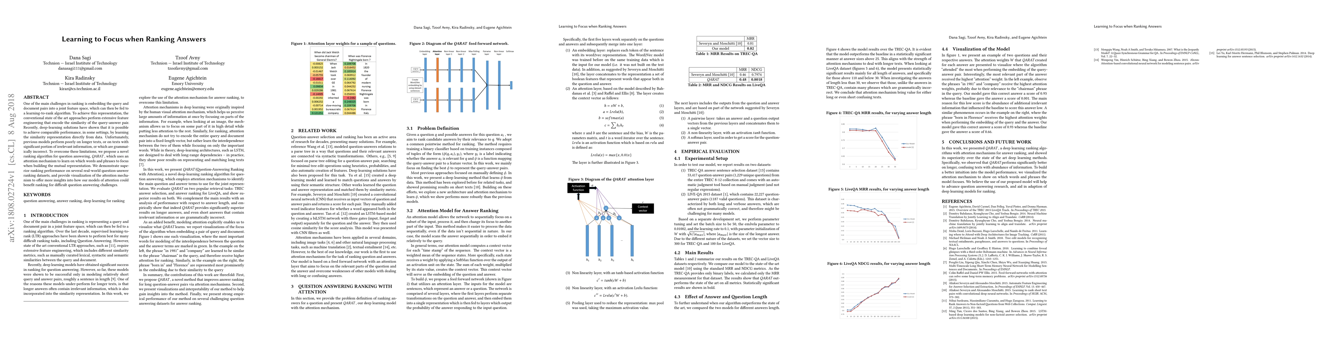 One of the main challenges in ranking is embedding the query and document pairs into a joint feature space, which can then be fed to a learning-to-rank algorithm. To achieve this representation, the conventional state of the art approaches perform extensive feature engineering that encode the similarity of the query-answer pair. Recently, deep-learning solutions have shown that it is possible to achieve comparable performance, in some settings, by learning the similarity representation directly from data. Unfortunately, previous models perform poorly on longer texts, or on texts with significant portion of irrelevant information, or which are grammatically incorrect. To overcome these limitations, we propose a novel ranking algorithm for question answering, QARAT, which uses an attention mechanism to learn on which words and phrases to focus when building the mutual representation. We demonstrate superior ranking performance on several real-world question-answer ranking datasets, and provide visualization of the attention mechanism to otter more insights into how our models of attention could benefit ranking for difficult question answering challenges.