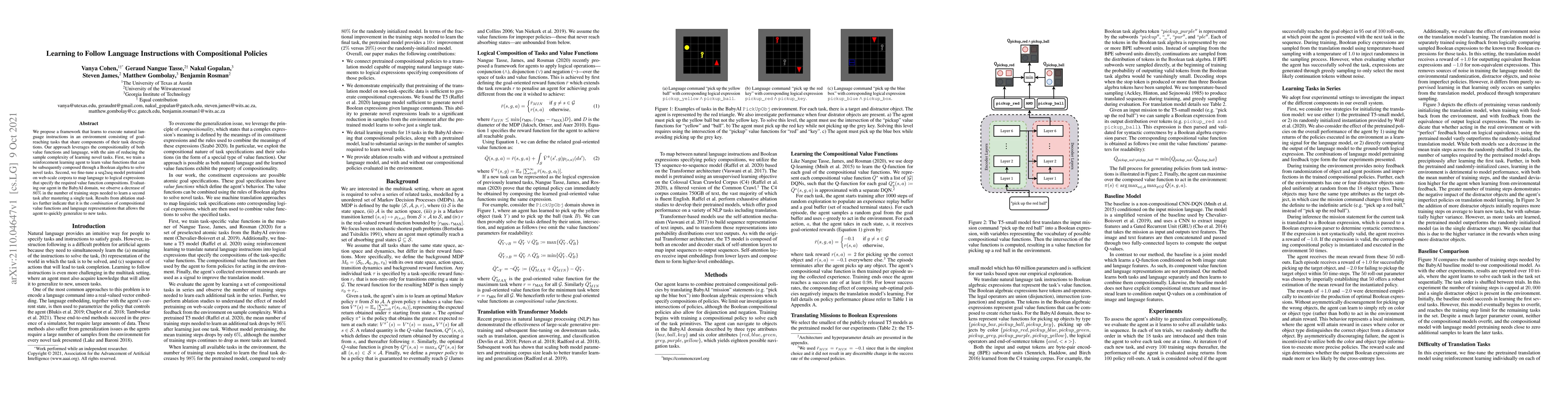 We propose a framework that learns to execute natural language instructions in an environment consisting of goal-reaching tasks that share components of their task descriptions. Our approach leverages the compositionality of both value functions and language, with the aim of reducing the sample complexity of learning novel tasks. First, we train a reinforcement learning agent to learn value functions that can be subsequently composed through a Boolean algebra to solve novel tasks. Second, we fine-tune a seq2seq model pretrained on web-scale corpora to map language to logical expressions that specify the required value function compositions. Evaluating our agent in the BabyAI domain, we observe a decrease of 86% in the number of training steps needed to learn a second task after mastering a single task. Results from ablation studies further indicate that it is the combination of compositional value functions and language representations that allows the agent to quickly generalize to new tasks.