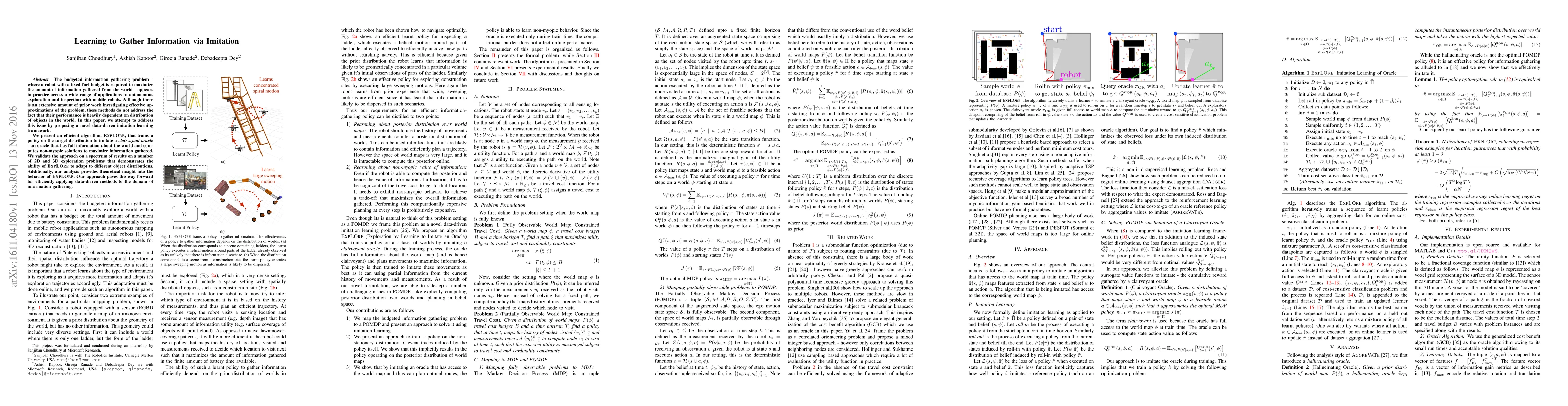 This paper proposes a novel imitation learning framework called EXPLORE to address the budgeted information gathering problem in mobile robots, aiming to maximize information collection under fuel constraints. The framework trains a policy to imitate a clairvoyant oracle, demonstrating adaptability across various object distributions and providing theoretical insights.