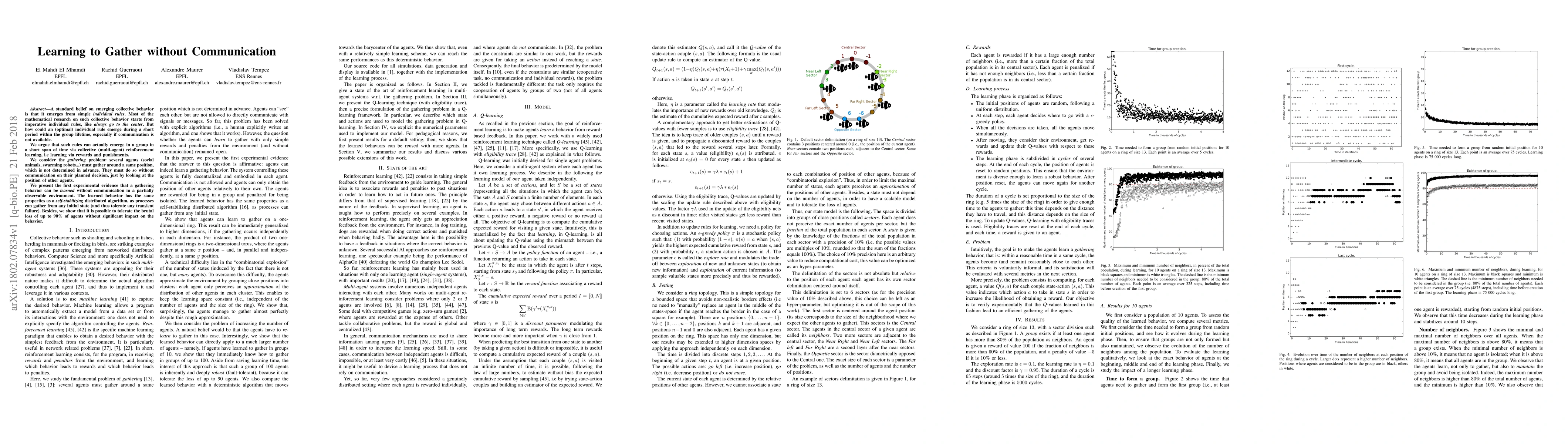 This paper explores how groups of agents can collectively learn to gather without communication through reinforcement learning. Experimental evidence shows that agents can develop optimal gathering behavior in a partially observable environment, demonstrating self-stabilizing properties and resilience to agent loss.