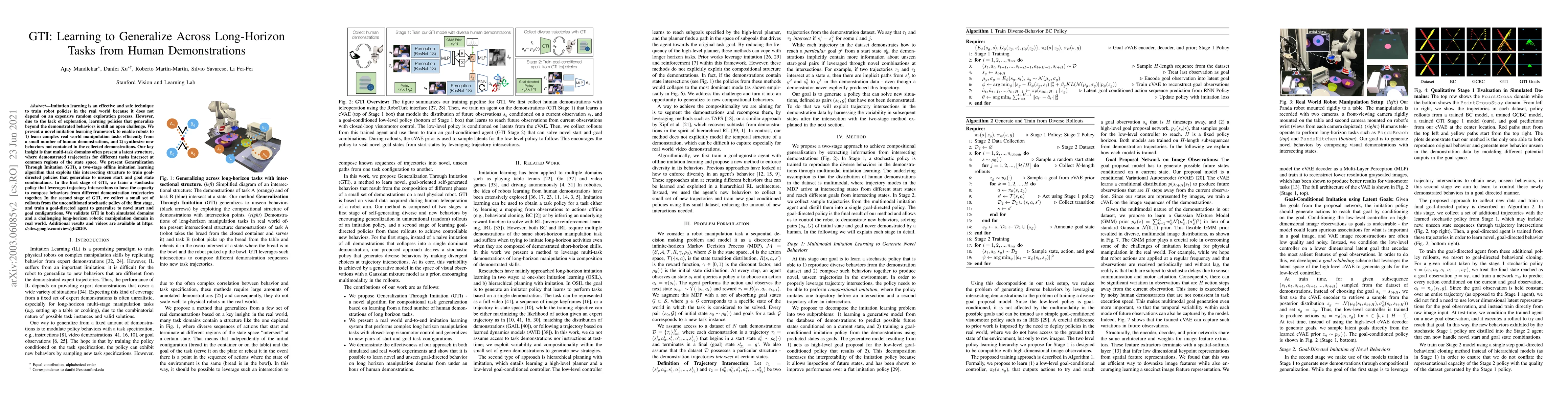 This paper introduces a novel imitation learning framework called Generalization Through Imitation (GTI) to enable robots to efficiently learn complex tasks from limited human demonstrations and generalize to new scenarios. The GTI algorithm leverages intersecting trajectories in multi-task domains to synthesize new behaviors and train goal-directed policies that generalize beyond demonstrated behaviors.