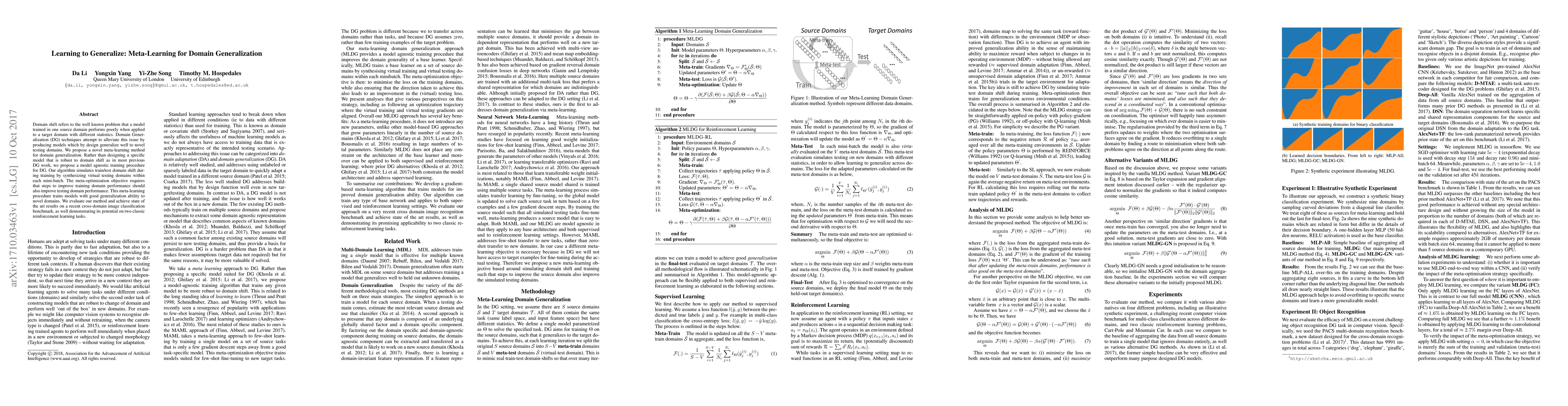 The paper proposes a meta-learning method for domain generalization that simulates train/test domain shift during training by synthesizing virtual testing domains within each mini-batch. The meta-optimization objective requires that steps to improve training domain performance should also improve testing domain performance.