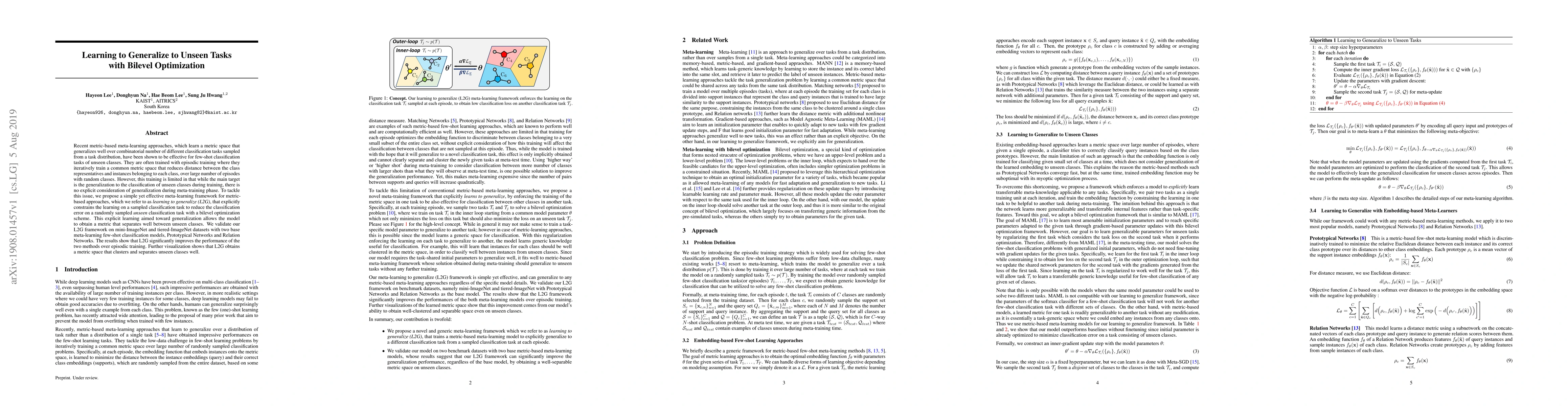 A new meta-learning framework called Learning to Generalize improves few-shot classification performance on unseen classes by explicitly constraining the model's learning towards generalization through bilevel optimization.