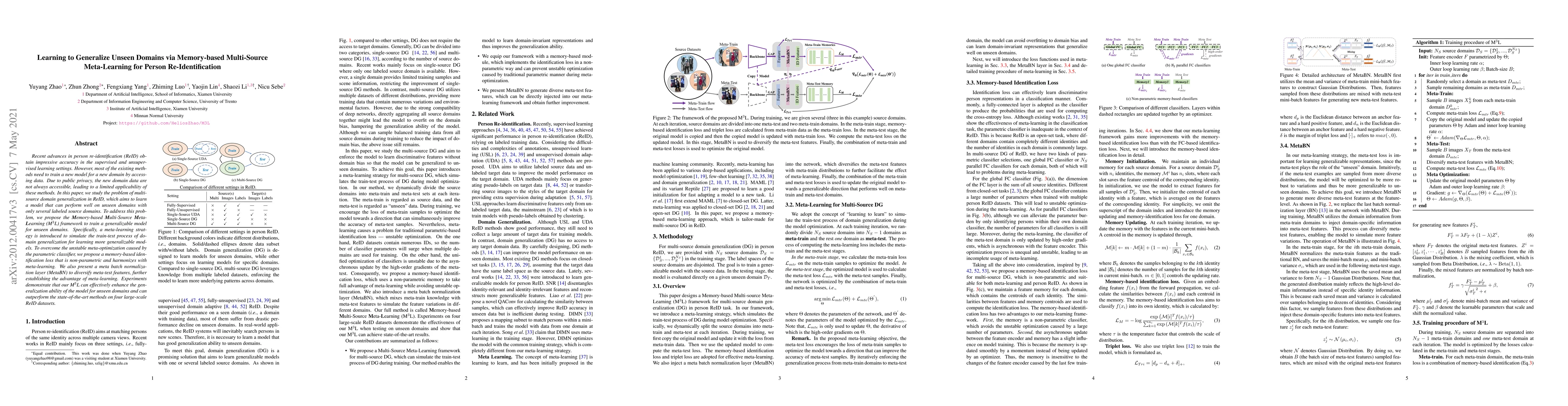 This paper proposes the Memory-based Multi-Source Meta-Learning (M$^3$L) framework to enhance the generalization of person re-identification models to unseen domains using only several labeled source domains. The approach combines meta-learning with a non-parametric memory-based identification loss and a meta batch normalization layer to improve model robustness and performance.
