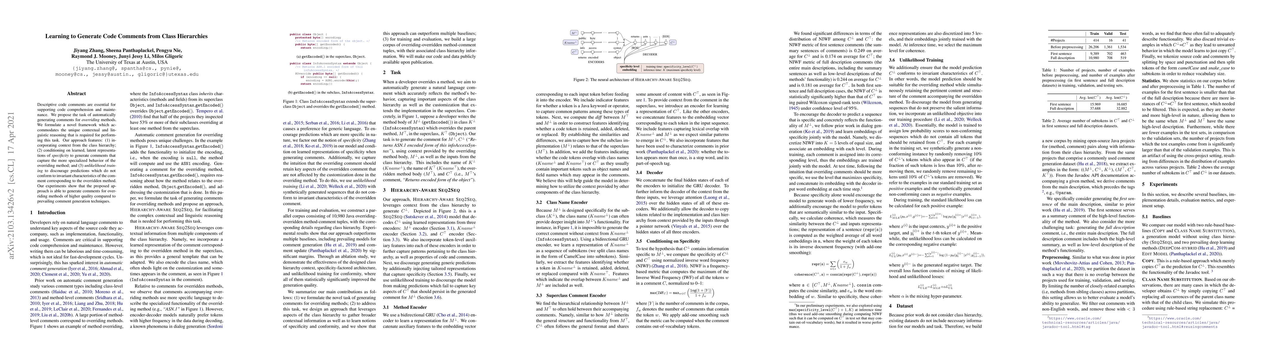 A new approach to generating code comments for overriding methods is proposed, incorporating class hierarchy context and learned representations of method specificity.
