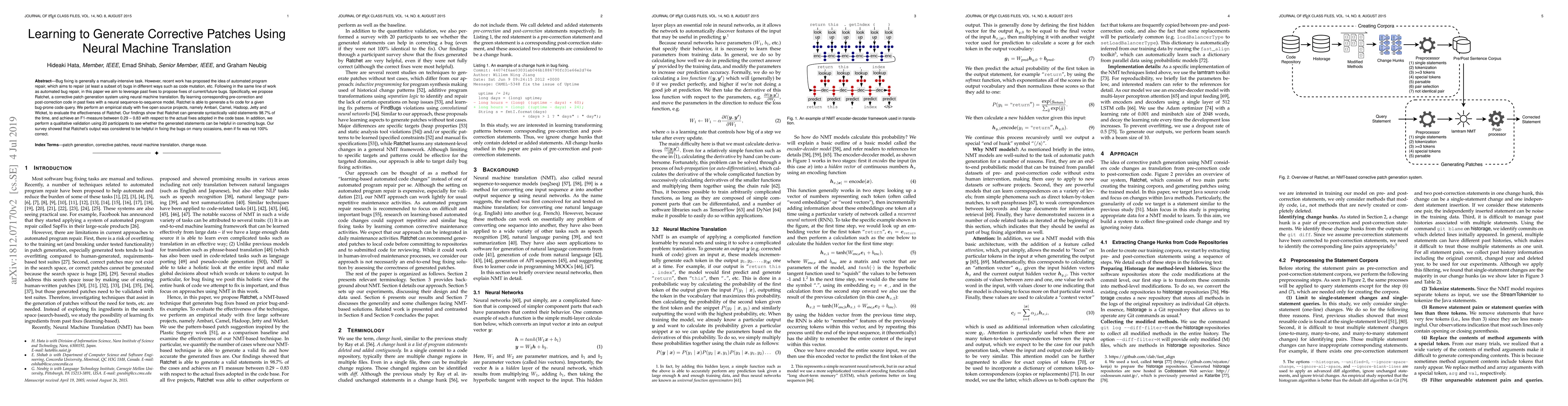 This paper introduces Ratchet, a system for generating corrective patches using neural machine translation to automate bug fixing. Empirical and qualitative evaluations on five open-source projects show that Ratchet can produce syntactically valid and useful fixes, though not always perfectly correct.