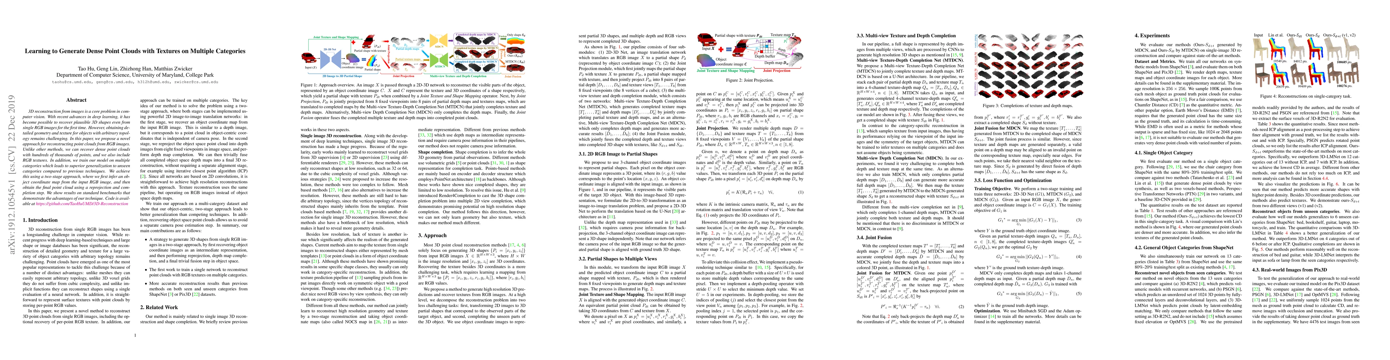 This paper proposes a novel deep learning method for generating dense textured point clouds from single RGB images, achieving high-fidelity 3D reconstructions with superior generalization across multiple categories. The approach uses a two-stage process involving an object coordinate map inference followed by reprojection and completion to produce detailed point clouds.