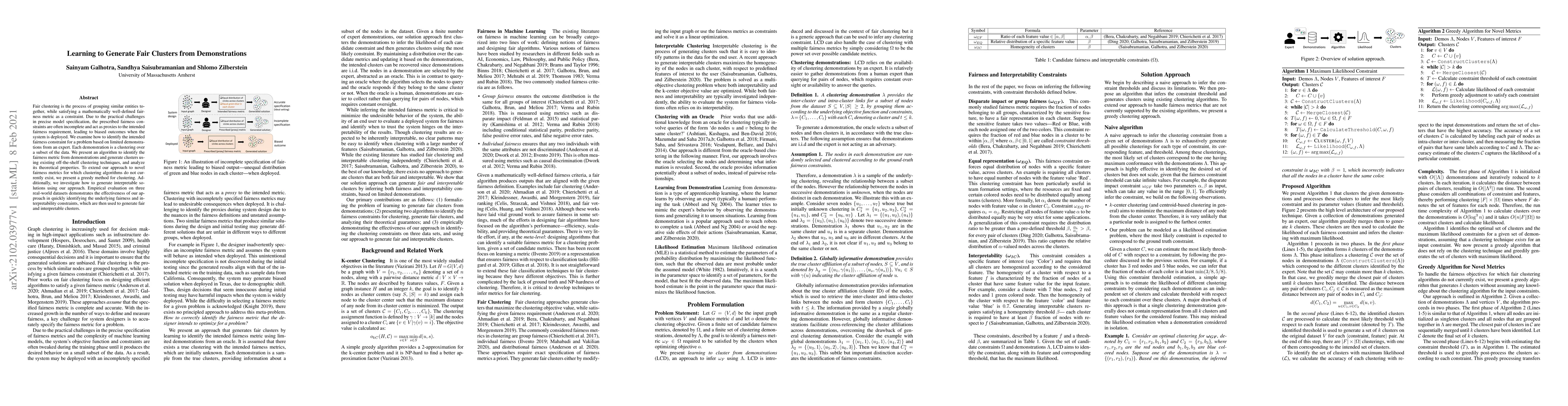 Fair clustering is the process of grouping similar entities together, while satisfying a mathematically well-defined fairness metric as a constraint. Due to the practical challenges in precise model specification, the prescribed fairness constraints are often incomplete and act as proxies to the intended fairness requirement, leading to biased outcomes when the system is deployed. We examine how to identify the intended fairness constraint for a problem based on limited demonstrations from an expert. Each demonstration is a clustering over a subset of the data. We present an algorithm to identify the fairness metric from demonstrations and generate clusters using existing off-the-shelf clustering techniques, and analyze its theoretical properties. To extend our approach to novel fairness metrics for which clustering algorithms do not currently exist, we present a greedy method for clustering. Additionally, we investigate how to generate interpretable solutions using our approach. Empirical evaluation on three real-world datasets demonstrates the effectiveness of our approach in quickly identifying the underlying fairness and interpretability constraints, which are then used to generate fair and interpretable clusters.