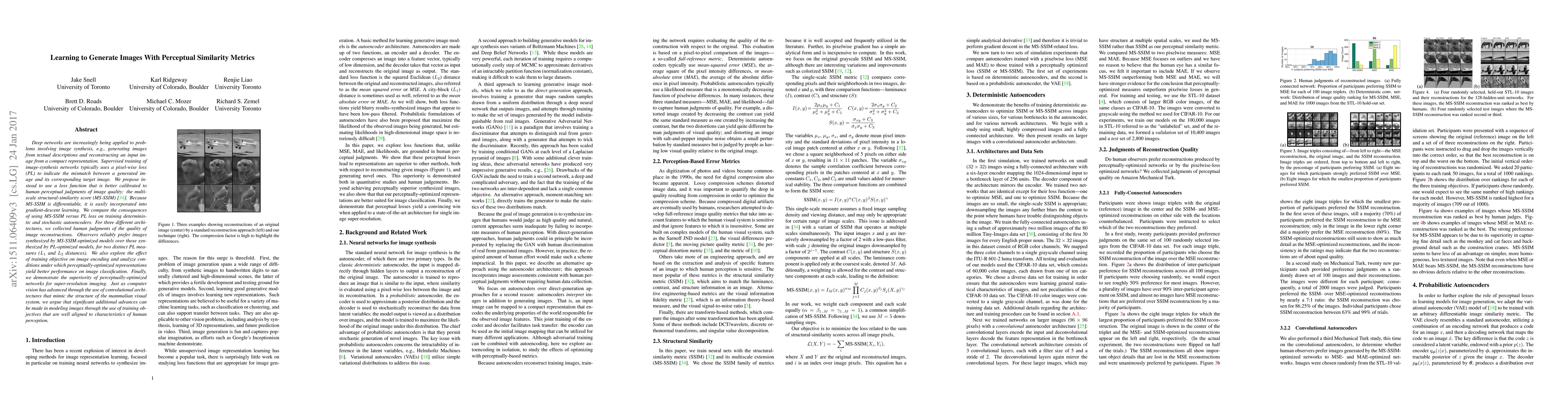 Researchers explored using a perceptual similarity metric called MS-SSIM to improve image synthesis in autoencoders, finding that models optimized with MS-SSIM outperformed those using traditional loss functions.