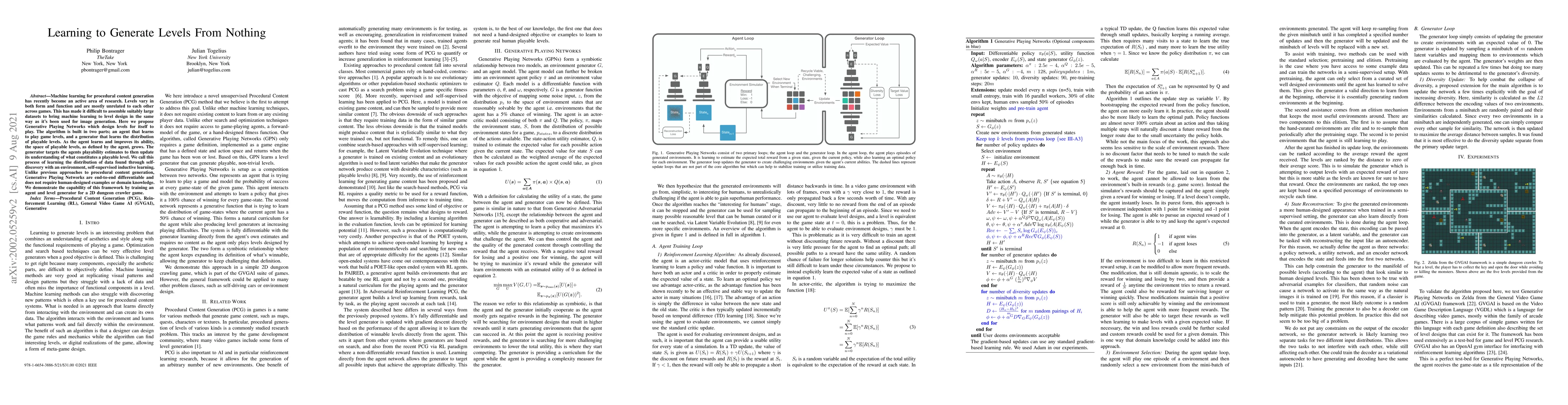 This paper introduces Generative Playing Networks, an AI framework that learns to generate game levels from scratch without human input, enabling self-supervised inductive learning and end-to-end differentiability.