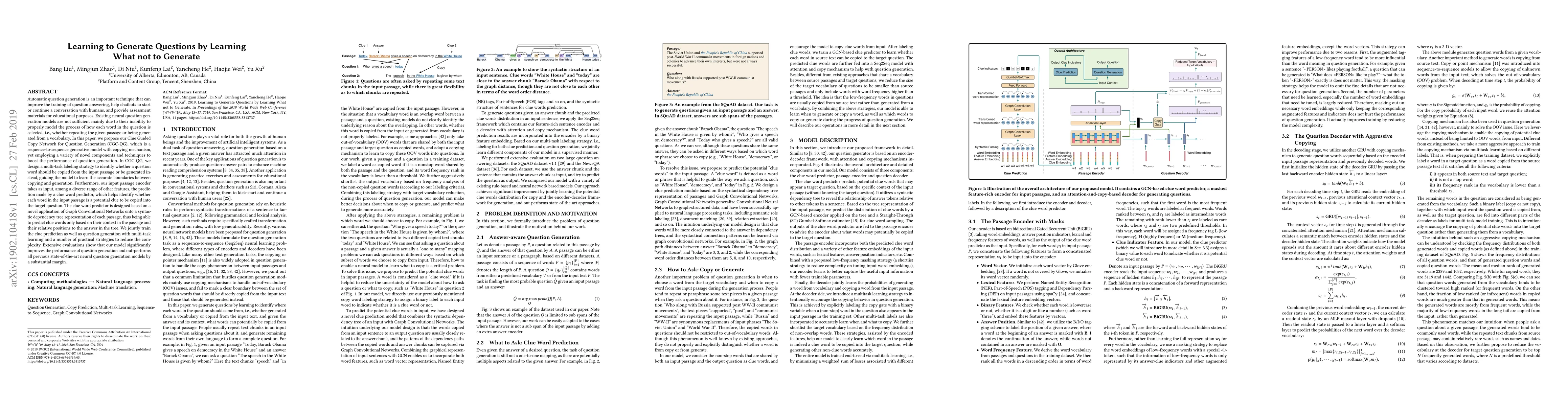 A new question generation model called Clue Guided Copy Network (CGC-QG) improves upon existing models by learning when to copy from an input passage or generate words, resulting in significant performance gains over state-of-the-art models.