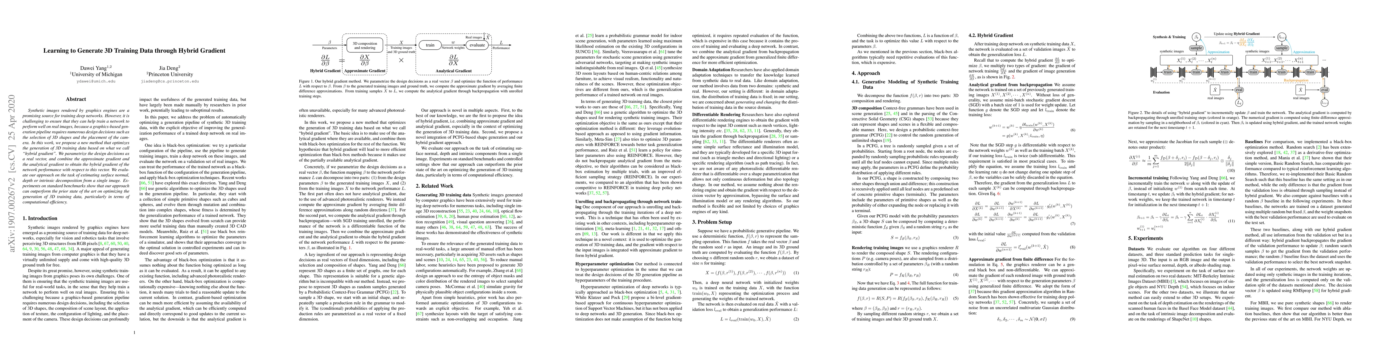 Synthetic images rendered by graphics engines are a promising source for training deep networks. However, it is challenging to ensure that they can help train a network to perform well on real images, because a graphics-based generation pipeline requires numerous design decisions such as the selection of 3D shapes and the placement of the camera. In this work, we propose a new method that optimizes the generation of 3D training data based on what we call "hybrid gradient". We parametrize the design decisions as a real vector, and combine the approximate gradient and the analytical gradient to obtain the hybrid gradient of the network performance with respect to this vector. We evaluate our approach on the task of estimating surface normal, depth or intrinsic decomposition from a single image. Experiments on standard benchmarks show that our approach can outperform the prior state of the art on optimizing the generation of 3D training data, particularly in terms of computational efficiency.