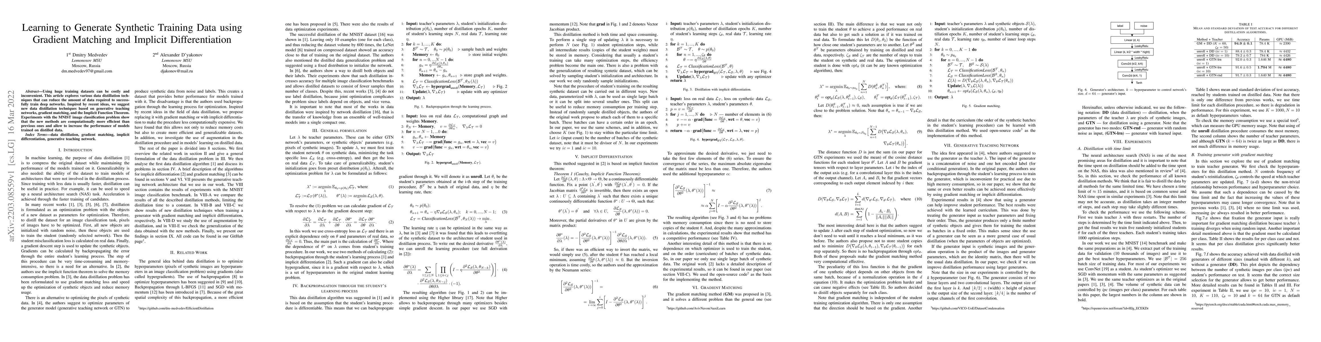 Using huge training datasets can be costly and inconvenient. This article explores various data distillation techniques that can reduce the amount of data required to successfully train deep networks. Inspired by recent ideas, we suggest new data distillation techniques based on generative teaching networks, gradient matching, and the Implicit Function Theorem. Experiments with the MNIST image classification problem show that the new methods are computationally more efficient than previous ones and allow to increase the performance of models trained on distilled data.