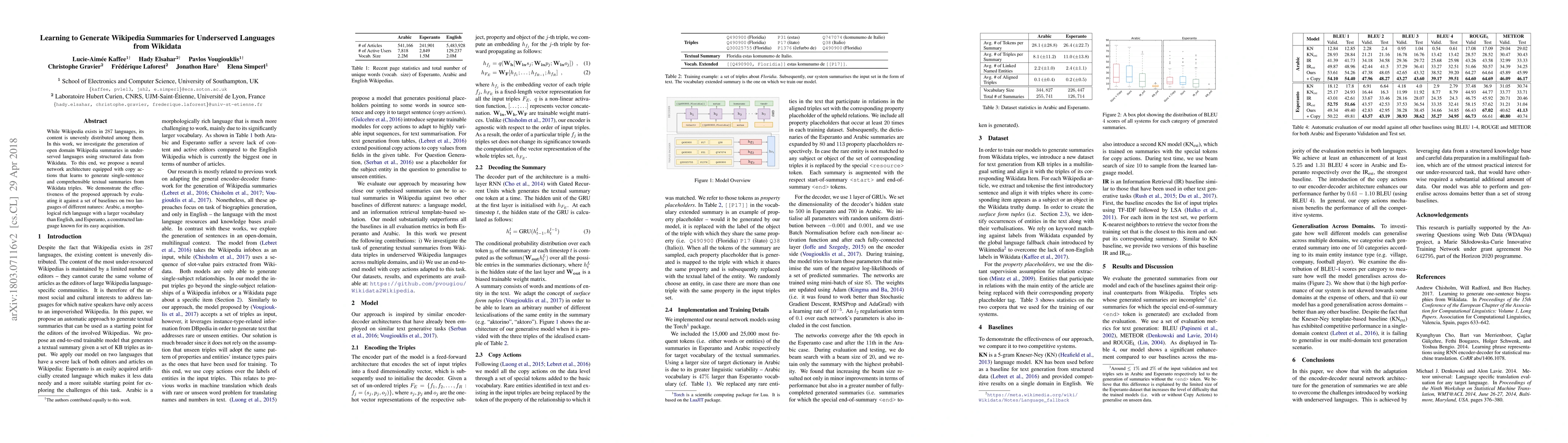 This paper proposes a neural network architecture with copy actions to generate Wikipedia summaries in underserved languages using Wikidata data. The effectiveness is demonstrated through evaluations on Arabic and Esperanto, showing the approach's potential to address content inequality in multilingual Wikipedia.