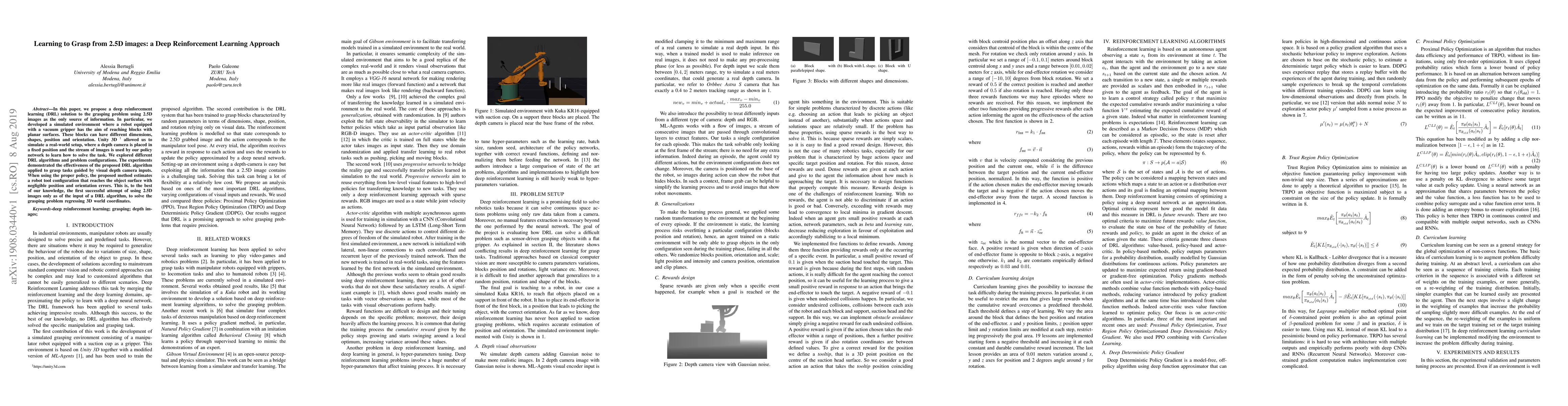 This is the first successful attempt to use 2.5D images only in a DRL algorithm to solve the grasping problem, estimating 3D world coordinates.