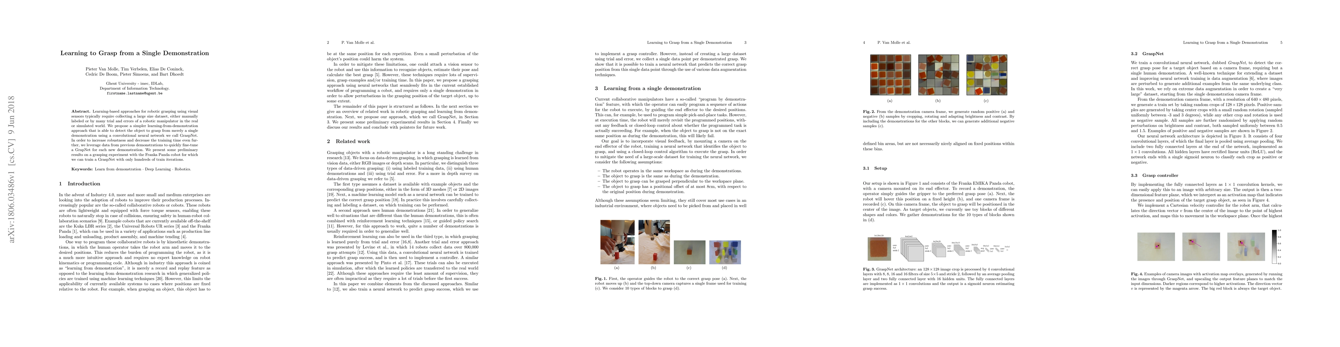 Learning-based approaches for robotic grasping using visual sensors typically require collecting a large size dataset, either manually labeled or by many trial and errors of a robotic manipulator in the real or simulated world. We propose a simpler learning-from-demonstration approach that is able to detect the object to grasp from merely a single demonstration using a convolutional neural network we call GraspNet. In order to increase robustness and decrease the training time even further, we leverage data from previous demonstrations to quickly fine-tune a GrapNet for each new demonstration. We present some preliminary results on a grasping experiment with the Franka Panda cobot for which we can train a GraspNet with only hundreds of train iterations.