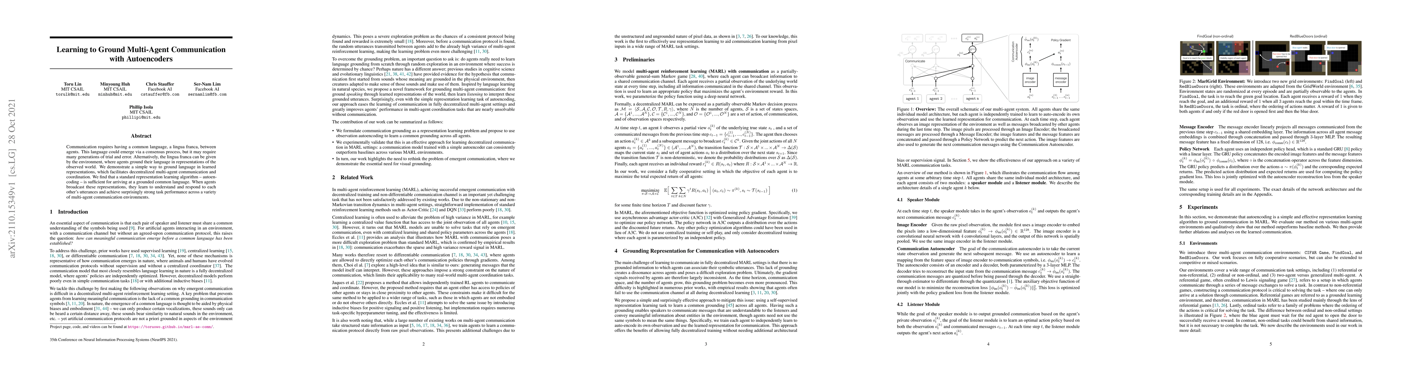 This paper explores how autoencoders can be used to ground multi-agent communication by learning shared representations, facilitating effective decentralized coordination. Agents achieve strong task performance by broadcasting and interpreting these representations, demonstrating the efficacy of autoencoding in establishing a common language.
