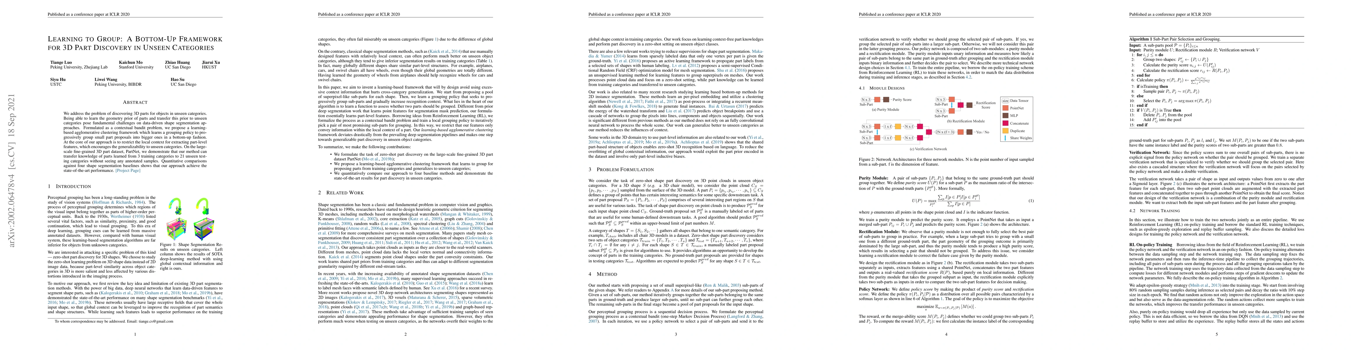 We address the problem of discovering 3D parts for objects in unseen categories. Being able to learn the geometry prior of parts and transfer this prior to unseen categories pose fundamental challenges on data-driven shape segmentation approaches. Formulated as a contextual bandit problem, we propose a learning-based agglomerative clustering framework which learns a grouping policy to progressively group small part proposals into bigger ones in a bottom-up fashion. At the core of our approach is to restrict the local context for extracting part-level features, which encourages the generalizability to unseen categories. On the large-scale fine-grained 3D part dataset, PartNet, we demonstrate that our method can transfer knowledge of parts learned from 3 training categories to 21 unseen testing categories without seeing any annotated samples. Quantitative comparisons against four shape segmentation baselines shows that our approach achieve the state-of-the-art performance.