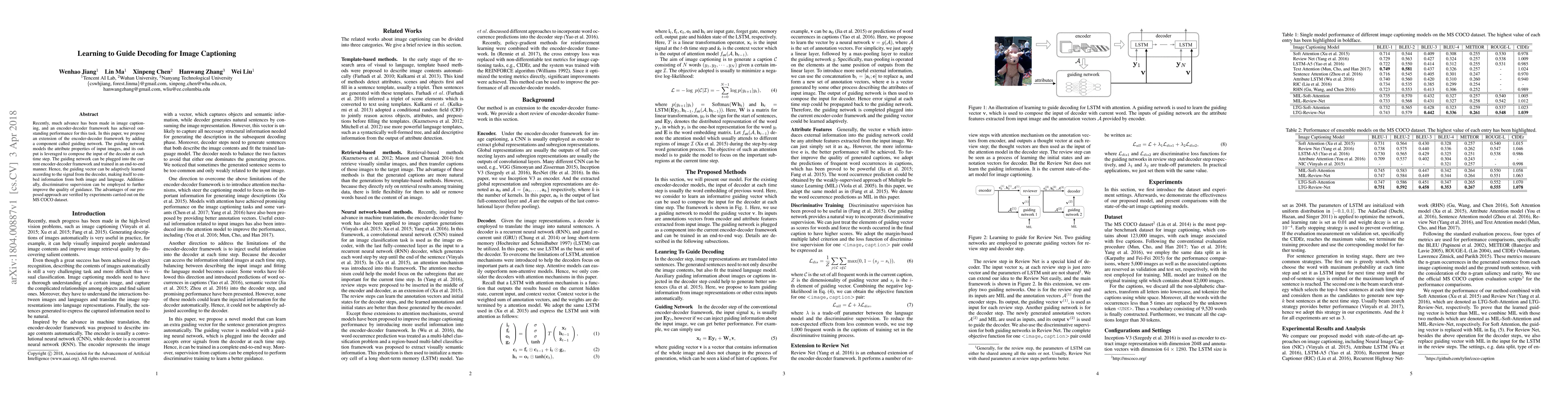 Recently, much advance has been made in image captioning, and an encoder-decoder framework has achieved outstanding performance for this task. In this paper, we propose an extension of the encoder-decoder framework by adding a component called guiding network. The guiding network models the attribute properties of input images, and its output is leveraged to compose the input of the decoder at each time step. The guiding network can be plugged into the current encoder-decoder framework and trained in an end-to-end manner. Hence, the guiding vector can be adaptively learned according to the signal from the decoder, making itself to embed information from both image and language. Additionally, discriminative supervision can be employed to further improve the quality of guidance. The advantages of our proposed approach are verified by experiments carried out on the MS COCO dataset.