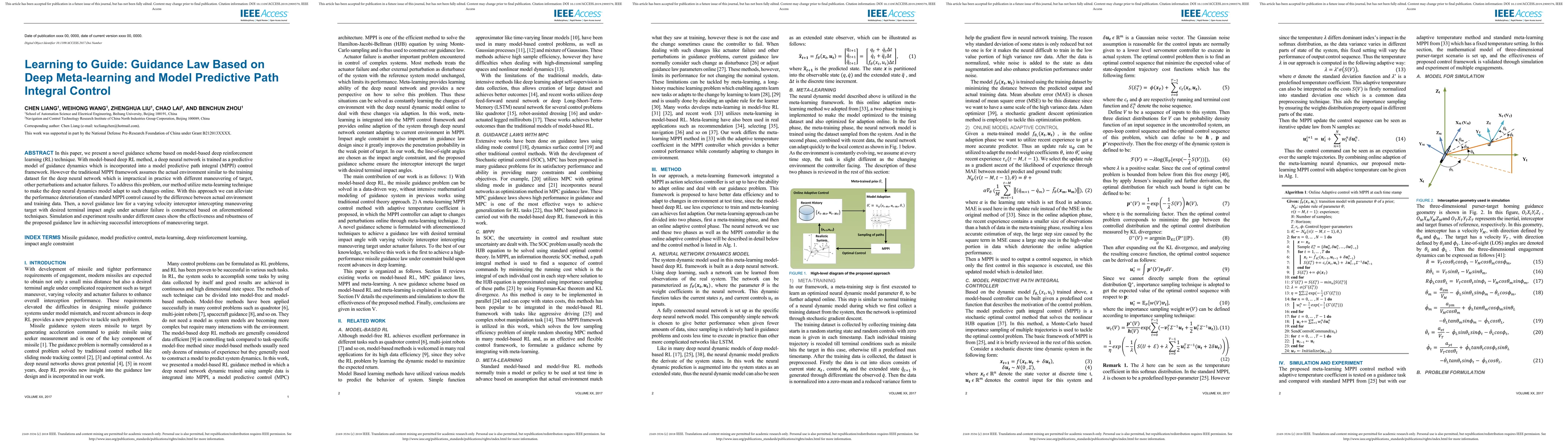 In this paper, we present a novel guidance scheme based on model-based deep reinforcement learning (RL) technique. With model-based deep RL method, a deep neural network is trained as a predictive model of guidance dynamics which is incorporated into a model predictive path integral (MPPI) control framework. However the traditional MPPI framework assumes the actual environment similar to the training dataset for the deep neural network which is impractical in practice with different maneuvering of target, other perturbations and actuator failures. To address this problem, our method utilize meta-learning technique to make the deep neural dynamics model adapt to such changes online. With this approach we can alleviate the performance deterioration of standard MPPI control caused by the difference between actual environment and training data. Then, a novel guidance law for a varying velocity interceptor intercepting maneuvering target with desired terminal impact angle under actuator failure is constructed based on aforementioned techniques. Simulation and experiment results under different cases show the effectiveness and robustness of the proposed guidance law in achieving successful interceptions of maneuvering target.