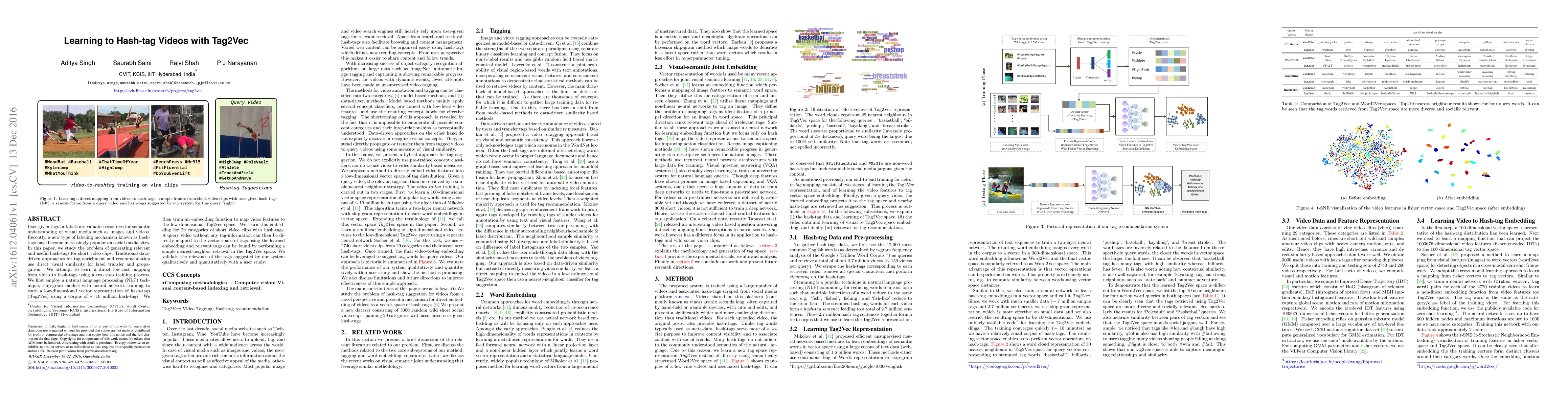 This paper proposes a method to generate relevant hashtags for short video clips using a two-step training process. It employs Tag2Vec, a low-dimensional vector representation of hashtags derived from NLP techniques, and maps video features to this space for tag recommendation, validated through user study.