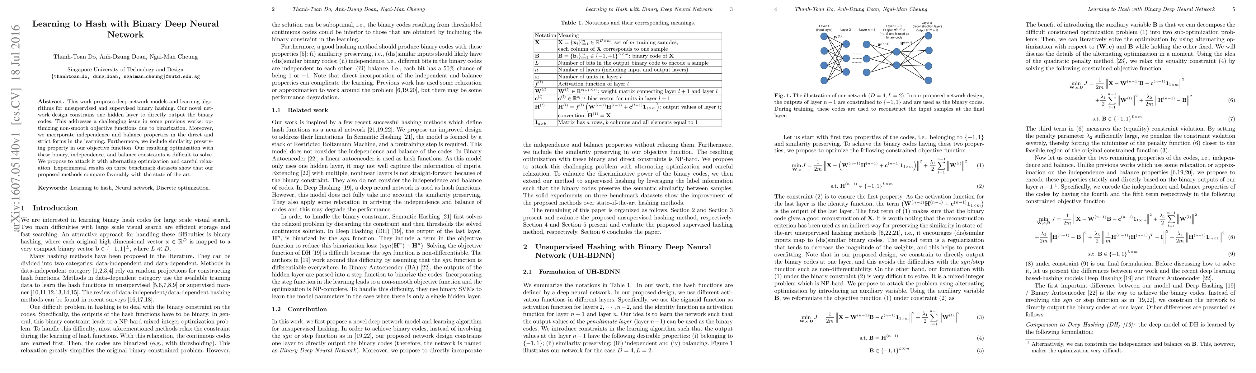 This work proposes deep network models and learning algorithms for unsupervised and supervised binary hashing. Our novel network design constrains one hidden layer to directly output the binary codes. This addresses a challenging issue in some previous works: optimizing non-smooth objective functions due to binarization. Moreover, we incorporate independence and balance properties in the direct and strict forms in the learning. Furthermore, we include similarity preserving property in our objective function. Our resulting optimization with these binary, independence, and balance constraints is difficult to solve. We propose to attack it with alternating optimization and careful relaxation. Experimental results on three benchmark datasets show that our proposed methods compare favorably with the state of the art.