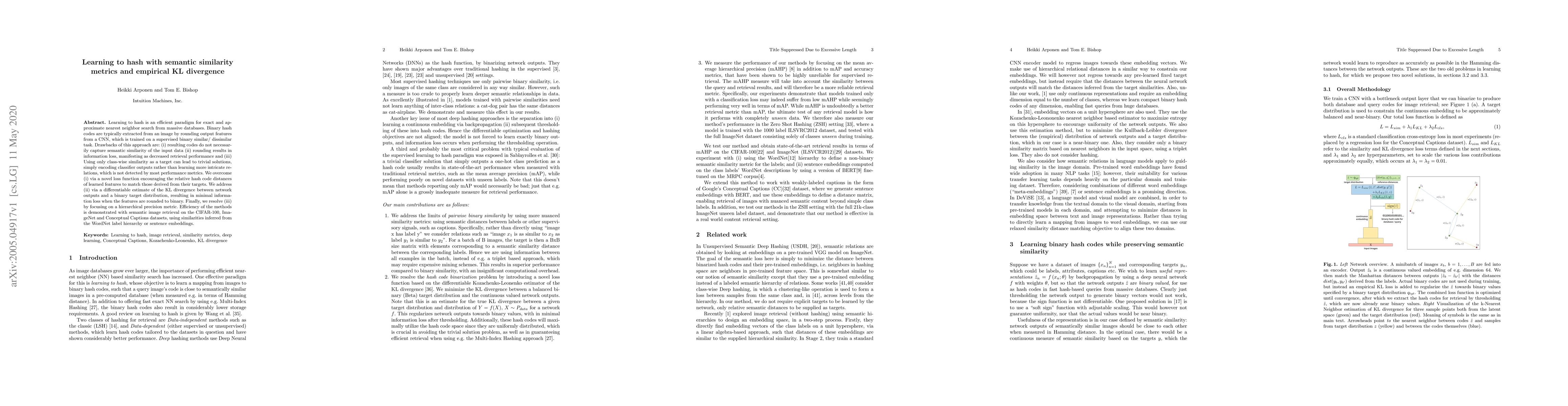 Learning to hash is an efficient paradigm for exact and approximate nearest neighbor search from massive databases. Binary hash codes are typically extracted from an image by rounding output features from a CNN, which is trained on a supervised binary similar/ dissimilar task. Drawbacks of this approach are: (i) resulting codes do not necessarily capture semantic similarity of the input data (ii) rounding results in information loss, manifesting as decreased retrieval performance and (iii) Using only class-wise similarity as a target can lead to trivial solutions, simply encoding classifier outputs rather than learning more intricate relations, which is not detected by most performance metrics. We overcome (i) via a novel loss function encouraging the relative hash code distances of learned features to match those derived from their targets. We address (ii) via a differentiable estimate of the KL divergence between network outputs and a binary target distribution, resulting in minimal information loss when the features are rounded to binary. Finally, we resolve (iii) by focusing on a hierarchical precision metric. Efficiency of the methods is demonstrated with semantic image retrieval on the CIFAR-100, ImageNet and Conceptual Captions datasets, using similarities inferred from the WordNet label hierarchy or sentence embeddings.