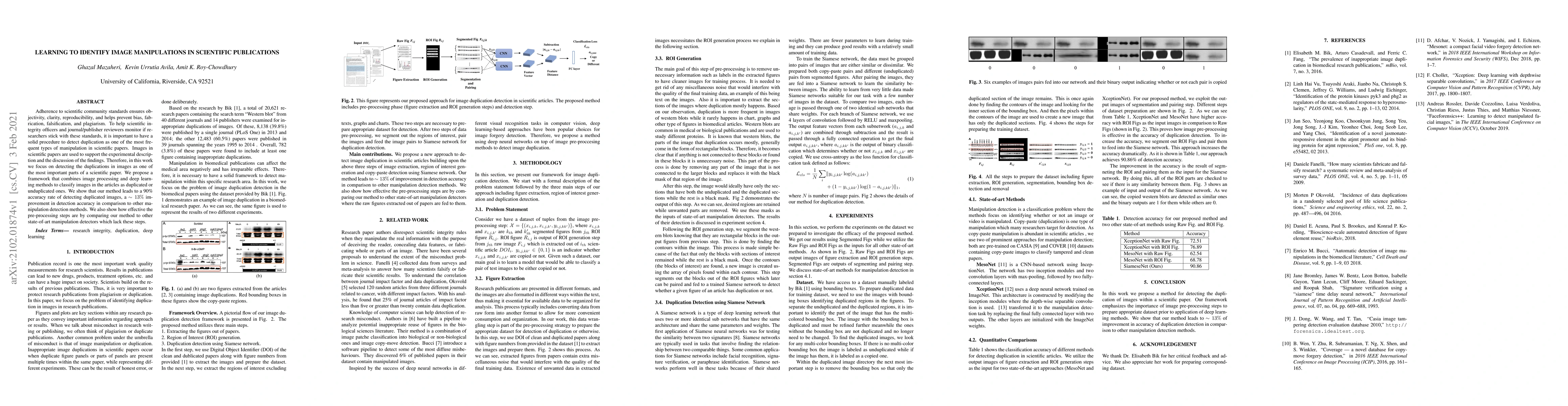 Adherence to scientific community standards ensures objectivity, clarity, reproducibility, and helps prevent bias, fabrication, falsification, and plagiarism. To help scientific integrity officers and journal/publisher reviewers monitor if researchers stick with these standards, it is important to have a solid procedure to detect duplication as one of the most frequent types of manipulation in scientific papers. Images in scientific papers are used to support the experimental description and the discussion of the findings. Therefore, in this work we focus on detecting the duplications in images as one of the most important parts of a scientific paper. We propose a framework that combines image processing and deep learning methods to classify images in the articles as duplicated or unduplicated ones. We show that our method leads to a 90% accuracy rate of detecting duplicated images, a ~ 13% improvement in detection accuracy in comparison to other manipulation detection methods. We also show how effective the pre-processing steps are by comparing our method to other state-of-art manipulation detectors which lack these steps.