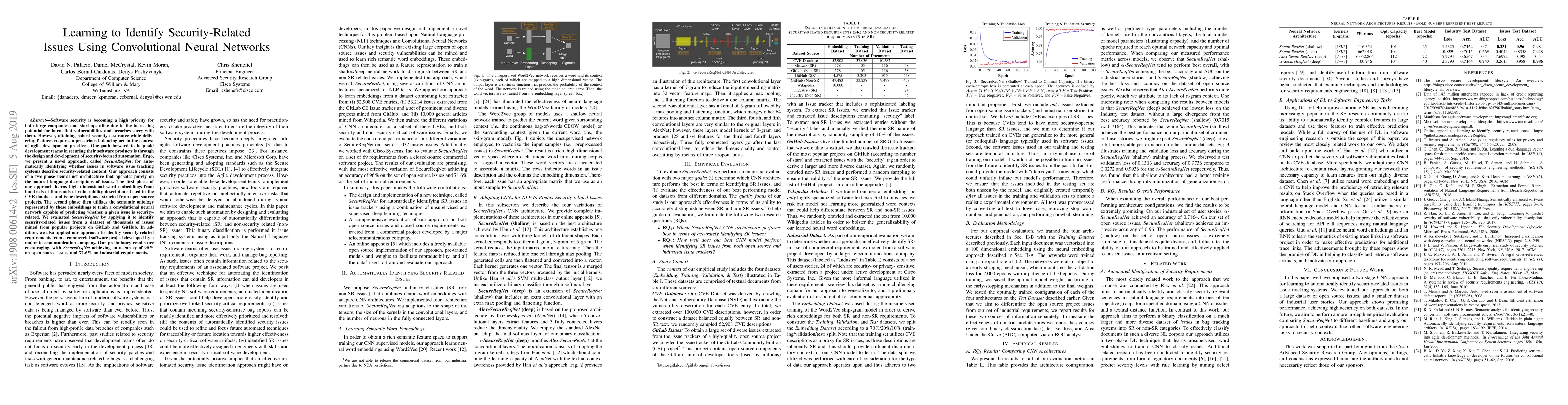 Software security is becoming a high priority for both large companies and start-ups alike due to the increasing potential for harm that vulnerabilities and breaches carry with them. However, attaining robust security assurance while delivering features requires a precarious balancing act in the context of agile development practices. One path forward to help aid development teams in securing their software products is through the design and development of security-focused automation. Ergo, we present a novel approach, called SecureReqNet, for automatically identifying whether issues in software issue tracking systems describe security-related content. Our approach consists of a two-phase neural net architecture that operates purely on the natural language descriptions of issues. The first phase of our approach learns high dimensional word embeddings from hundreds of thousands of vulnerability descriptions listed in the CVE database and issue descriptions extracted from open source projects. The second phase then utilizes the semantic ontology represented by these embeddings to train a convolutional neural network capable of predicting whether a given issue is security-related. We evaluated SecureReqNet by applying it to identify security-related issues from a dataset of thousands of issues mined from popular projects on GitLab and GitHub. In addition, we also applied our approach to identify security-related requirements from a commercial software project developed by a major telecommunication company. Our preliminary results are encouraging, with SecureReqNet achieving an accuracy of 96% on open source issues and 71.6% on industrial requirements.