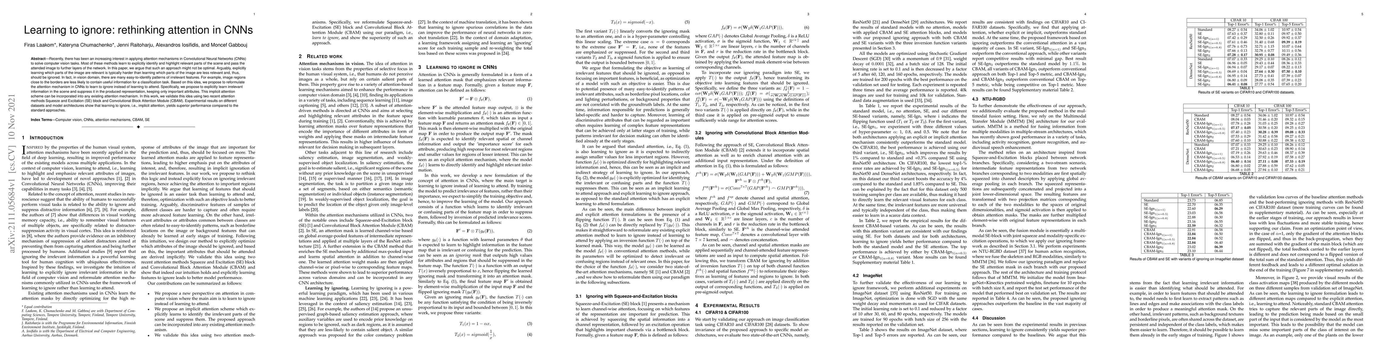 The paper proposes a new approach to attention in CNNs by focusing on learning to ignore irrelevant parts of an image rather than explicitly highlighting important regions. Experimental results show that this implicit attention method improves performance across various datasets and models.