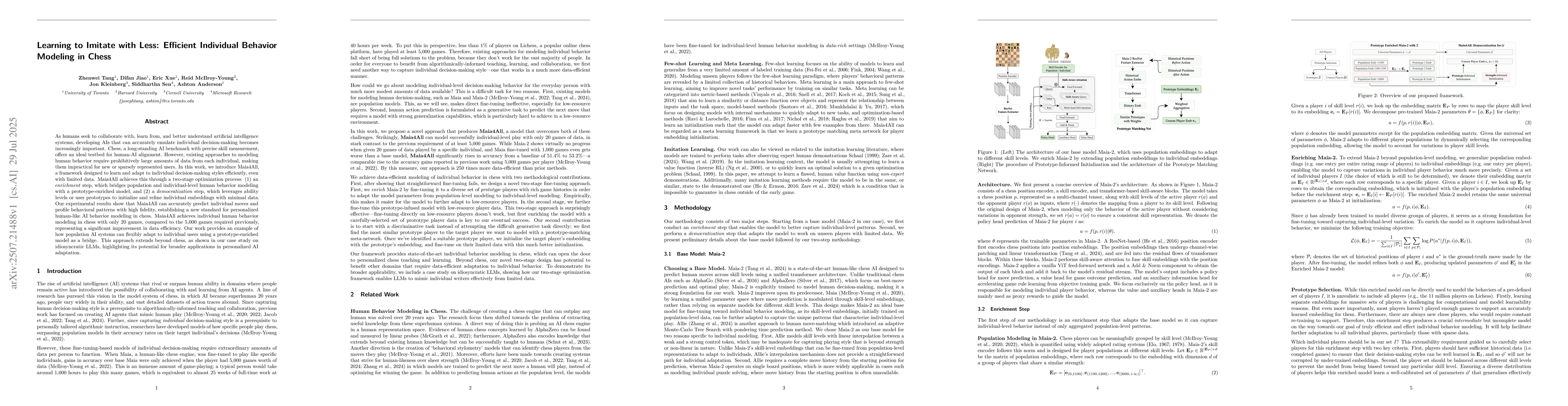 As humans seek to collaborate with, learn from, and better understand artificial intelligence systems, developing AIs that can accurately emulate individual decision-making becomes increasingly important. Chess, a long-standing AI benchmark with precise skill measurement, offers an ideal testbed for human-AI alignment. However, existing approaches to modeling human behavior require prohibitively large amounts of data from each individual, making them impractical for new or sparsely represented users. In this work, we introduce Maia4All, a framework designed to learn and adapt to individual decision-making styles efficiently, even with limited data. Maia4All achieves this through a two-stage optimization process: (1) an enrichment step, which bridges population and individual-level human behavior modeling with a prototype-enriched model, and (2) a democratization step, which leverages ability levels or user prototypes to initialize and refine individual embeddings with minimal data. Our experimental results show that Maia4All can accurately predict individual moves and profile behavioral patterns with high fidelity, establishing a new standard for personalized human-like AI behavior modeling in chess. Maia4All achieves individual human behavior modeling in chess with only 20 games, compared to the 5,000 games required previously, representing a significant improvement in data efficiency. Our work provides an example of how population AI systems can flexibly adapt to individual users using a prototype-enriched model as a bridge. This approach extends beyond chess, as shown in our case study on idiosyncratic LLMs, highlighting its potential for broader applications in personalized AI adaptation.