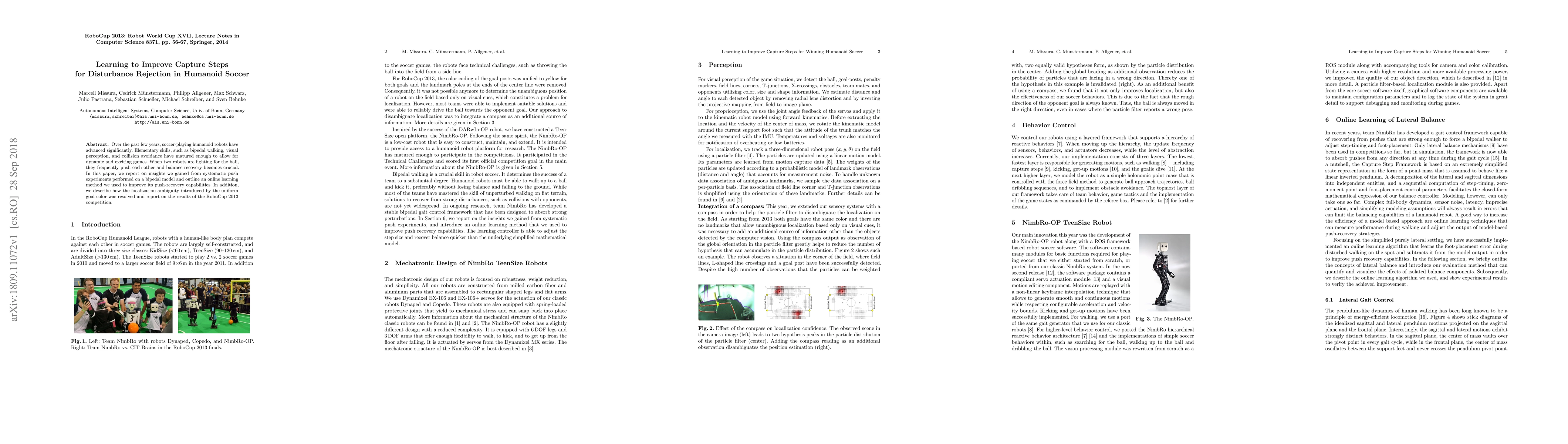 Over the past few years, soccer-playing humanoid robots have advanced significantly. Elementary skills, such as bipedal walking, visual perception, and collision avoidance have matured enough to allow for dynamic and exciting games. When two robots are fighting for the ball, they frequently push each other and balance recovery becomes crucial. In this paper, we report on insights we gained from systematic push experiments performed on a bipedal model and outline an online learning method we used to improve its push-recovery capabilities. In addition, we describe how the localization ambiguity introduced by the uniform goal color was resolved and report on the results of the RoboCup 2013 competition.