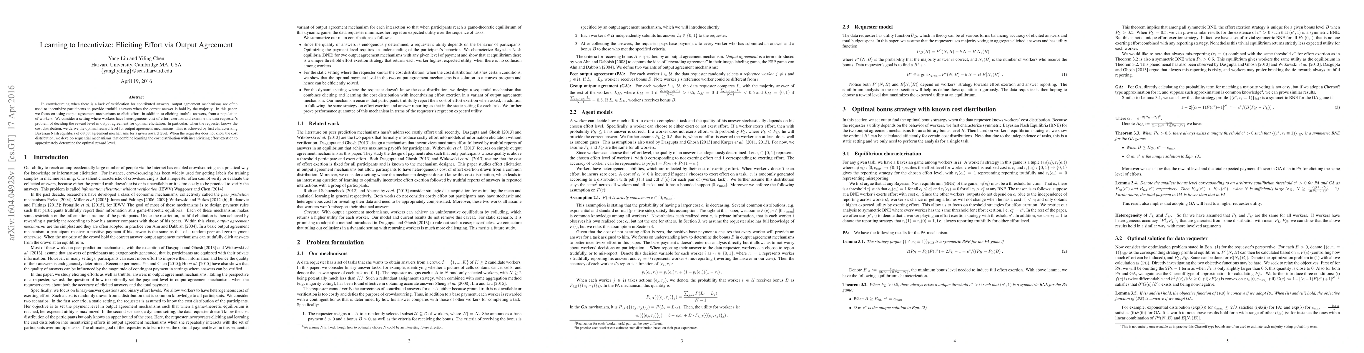 This research derives optimal reward levels for output agreement mechanisms in crowdsourcing to incentivize both truthful answers and effort from workers with varying effort costs. When cost distribution is known, it precisely determines the reward level. When unknown, it proposes sequential mechanisms combining learning and effort incentivization to approximate optimal rewards.