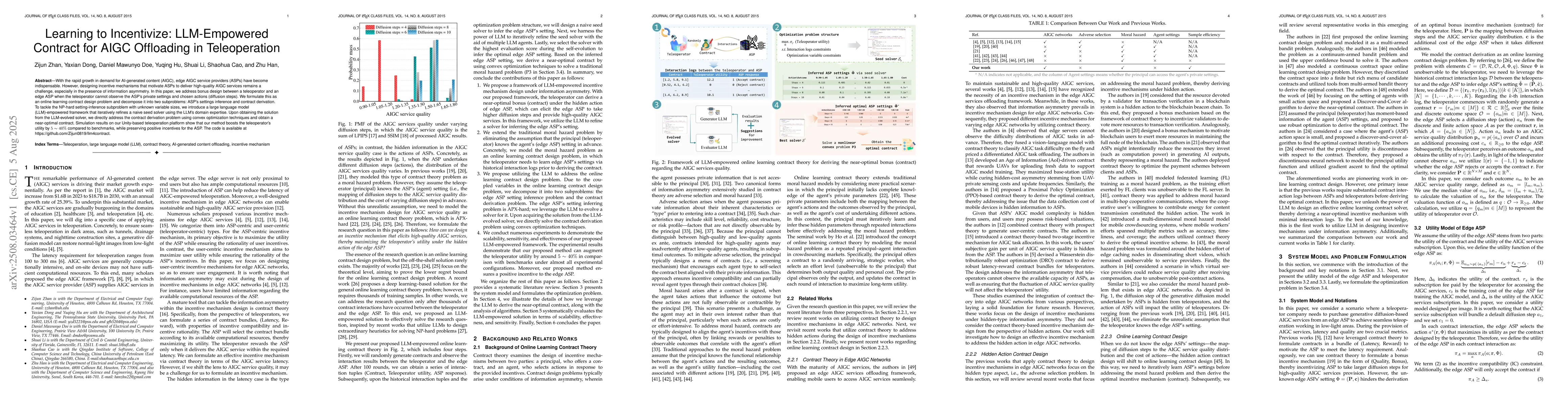 With the rapid growth in demand for AI-generated content (AIGC), edge AIGC service providers (ASPs) have become indispensable. However, designing incentive mechanisms that motivate ASPs to deliver high-quality AIGC services remains a challenge, especially in the presence of information asymmetry. In this paper, we address bonus design between a teleoperator and an edge ASP when the teleoperator cannot observe the ASP's private settings and chosen actions (diffusion steps). We formulate this as an online learning contract design problem and decompose it into two subproblems: ASP's settings inference and contract derivation. To tackle the NP-hard setting-inference subproblem with unknown variable sizes, we introduce a large language model (LLM)-empowered framework that iteratively refines a naive seed solver using the LLM's domain expertise. Upon obtaining the solution from the LLM-evolved solver, we directly address the contract derivation problem using convex optimization techniques and obtain a near-optimal contract. Simulation results on our Unity-based teleoperation platform show that our method boosts the teleoperator's utility by $5 \sim 40\%$ compared to benchmarks, while preserving positive incentives for the ASP. The code is available at https://github.com/Zijun0819/llm4contract.