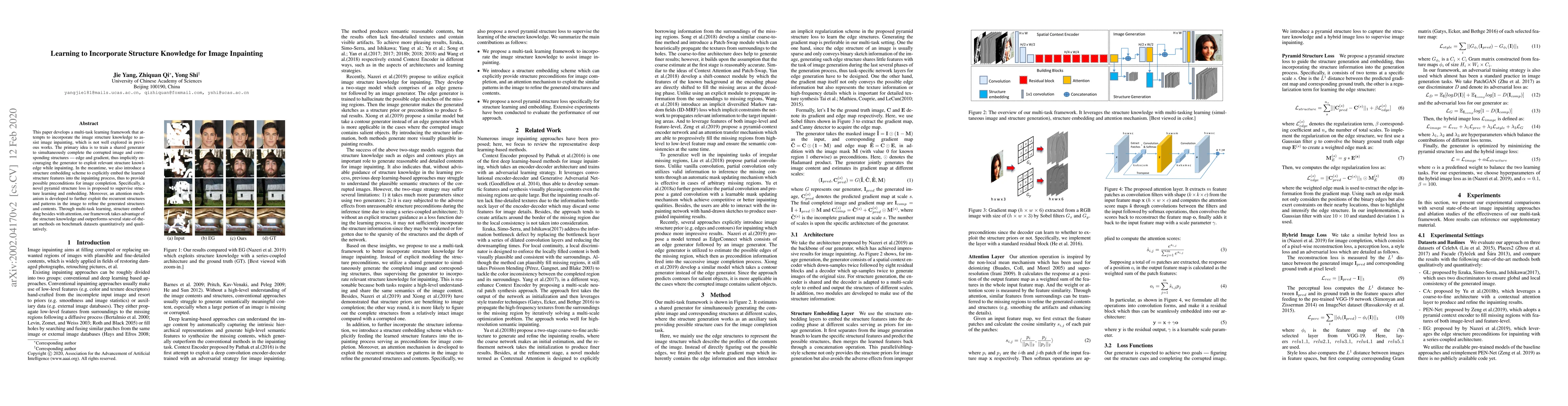 This paper proposes a multi-task learning framework to enhance image inpainting by incorporating structural knowledge, including edge and gradient information. The framework uses a shared generator and a structure embedding scheme, along with an attention mechanism, to outperform existing methods on benchmark datasets.