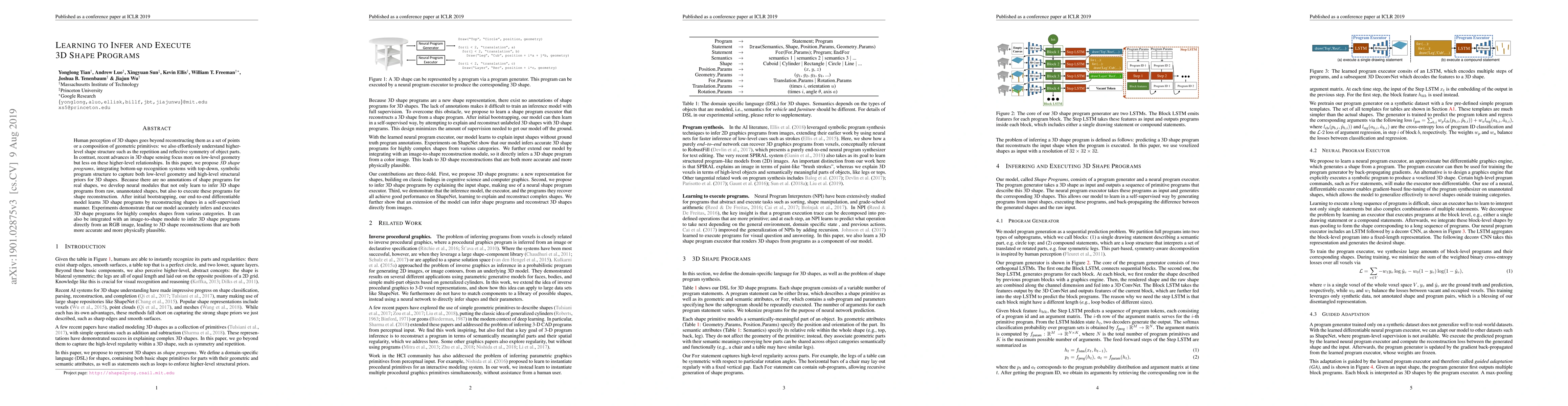 This paper proposes 3D shape programs that combine low-level geometry with high-level structural priors for better 3D shape understanding. The model learns to infer and execute these programs from unannotated shapes, enabling accurate reconstruction of complex shapes and integration with image-to-shape modules for RGB-based 3D reconstructions.