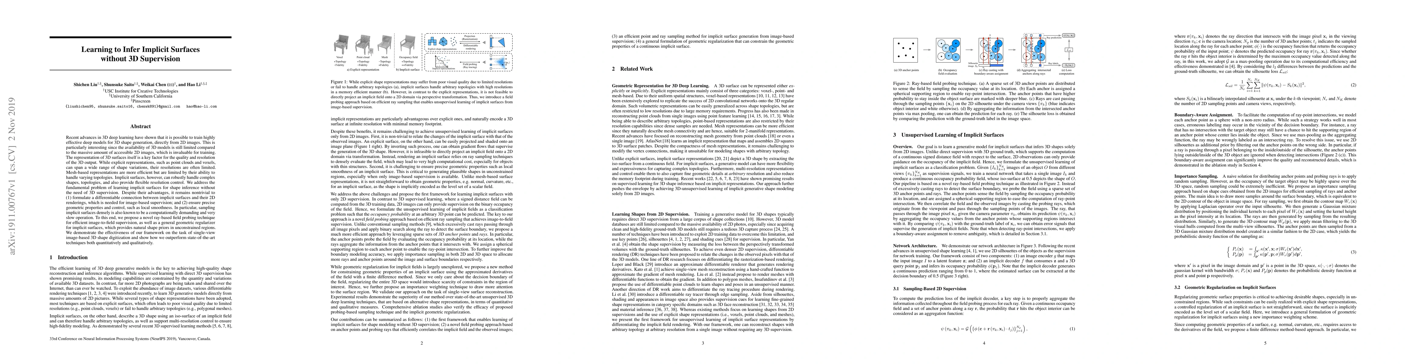 This paper proposes a novel method to infer implicit surfaces from 2D images without requiring 3D supervision, addressing the challenge of formulating a differentiable connection between implicit surfaces and their 2D renderings. The authors introduce a ray-based field probing technique and a geometric regularizer to ensure precise geometric properties, demonstrating superior performance in single-view image-based 3D shape digitization.