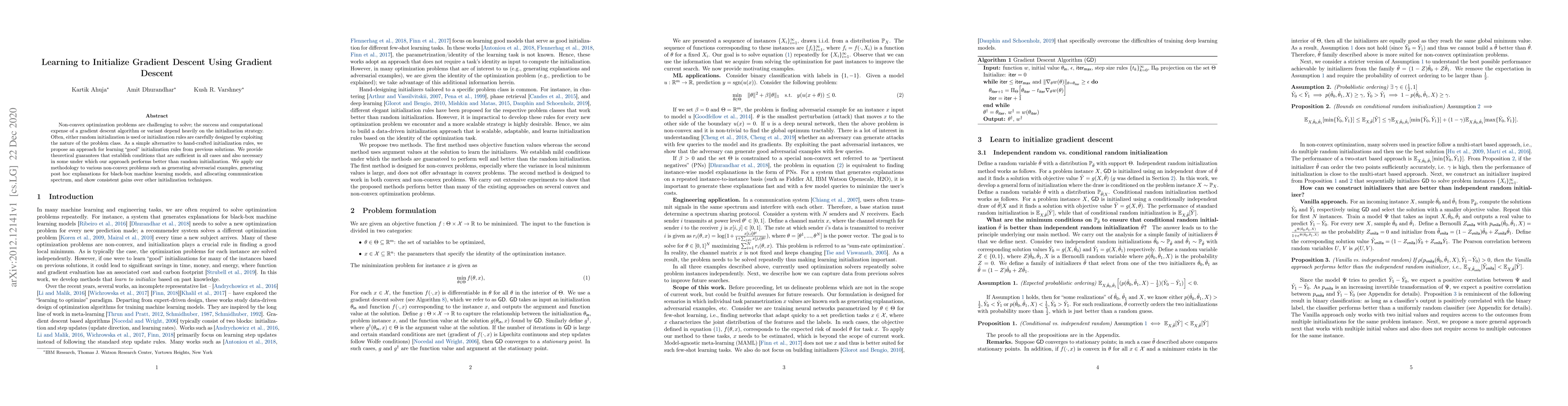 Non-convex optimization problems are challenging to solve; the success and computational expense of a gradient descent algorithm or variant depend heavily on the initialization strategy. Often, either random initialization is used or initialization rules are carefully designed by exploiting the nature of the problem class. As a simple alternative to hand-crafted initialization rules, we propose an approach for learning "good" initialization rules from previous solutions. We provide theoretical guarantees that establish conditions that are sufficient in all cases and also necessary in some under which our approach performs better than random initialization. We apply our methodology to various non-convex problems such as generating adversarial examples, generating post hoc explanations for black-box machine learning models, and allocating communication spectrum, and show consistent gains over other initialization techniques.