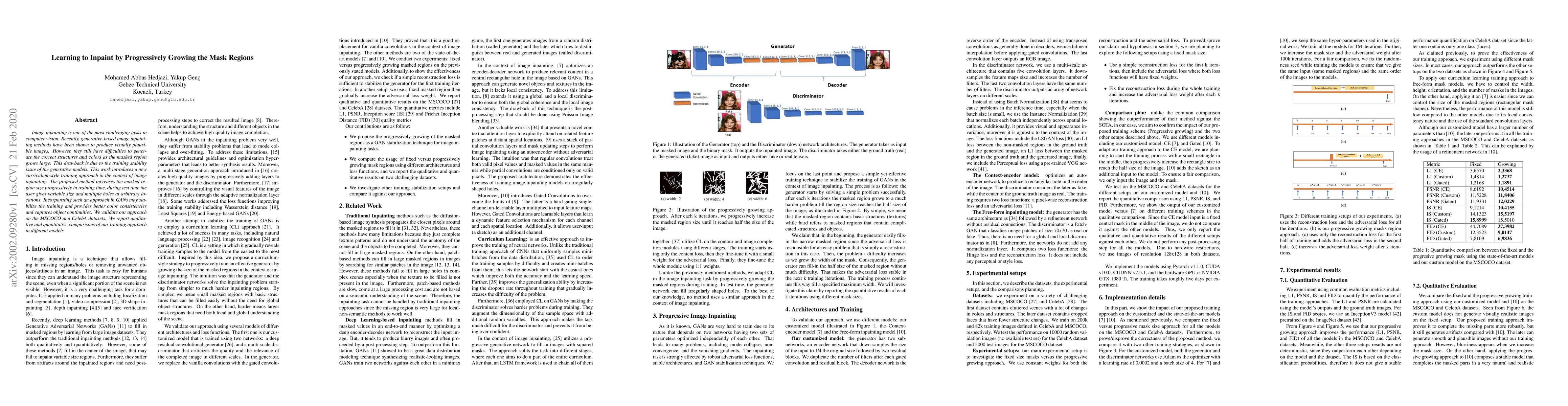 Image inpainting is one of the most challenging tasks in computer vision. Recently, generative-based image inpainting methods have been shown to produce visually plausible images. However, they still have difficulties to generate the correct structures and colors as the masked region grows large. This drawback is due to the training stability issue of the generative models. This work introduces a new curriculum-style training approach in the context of image inpainting. The proposed method increases the masked region size progressively in training time, during test time the user gives variable size and multiple holes at arbitrary locations. Incorporating such an approach in GANs may stabilize the training and provides better color consistencies and captures object continuities. We validate our approach on the MSCOCO and CelebA datasets. We report qualitative and quantitative comparisons of our training approach in different models.